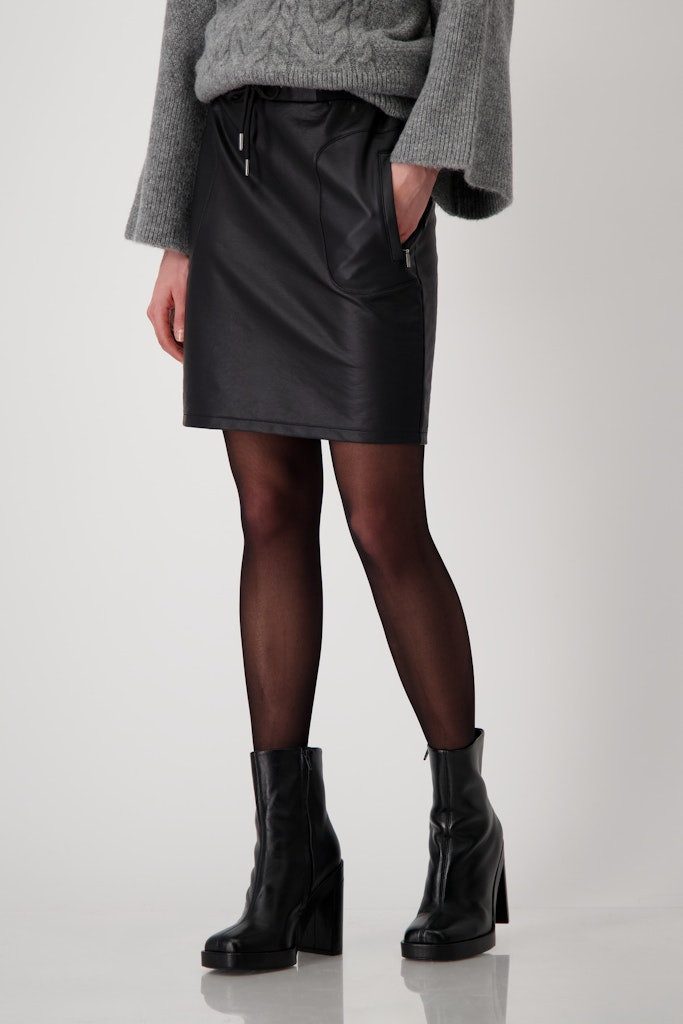 Der Minirock aus hochwertiger Baumwolle besticht durch seine Lederoptik-Beschichtung und den elastischen Bund mit Bindeband. Praktische seitliche Taschen mit Reißverschluss runden das Design ab.* Oberstoff: 95% Baumwolle, 5% Elasthan