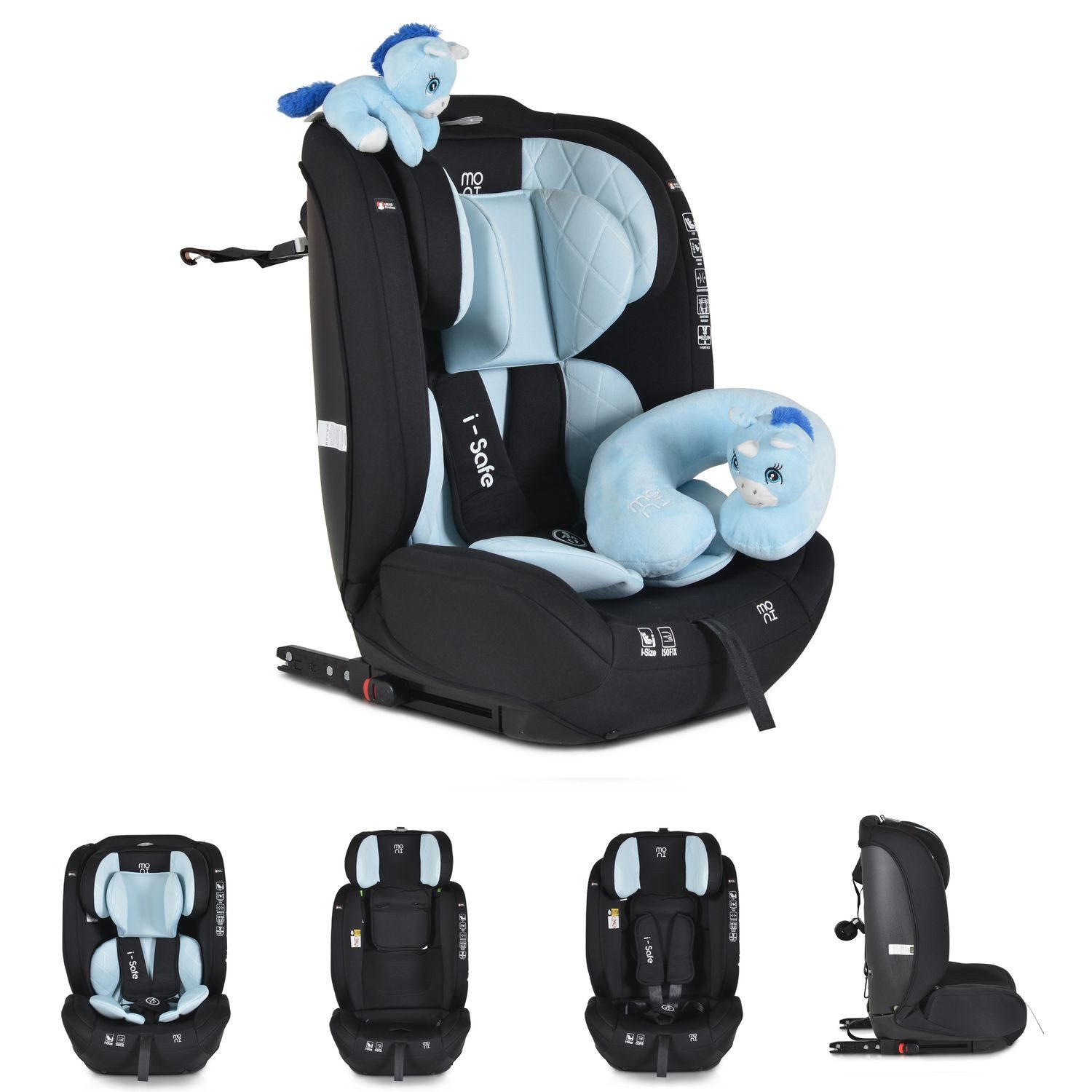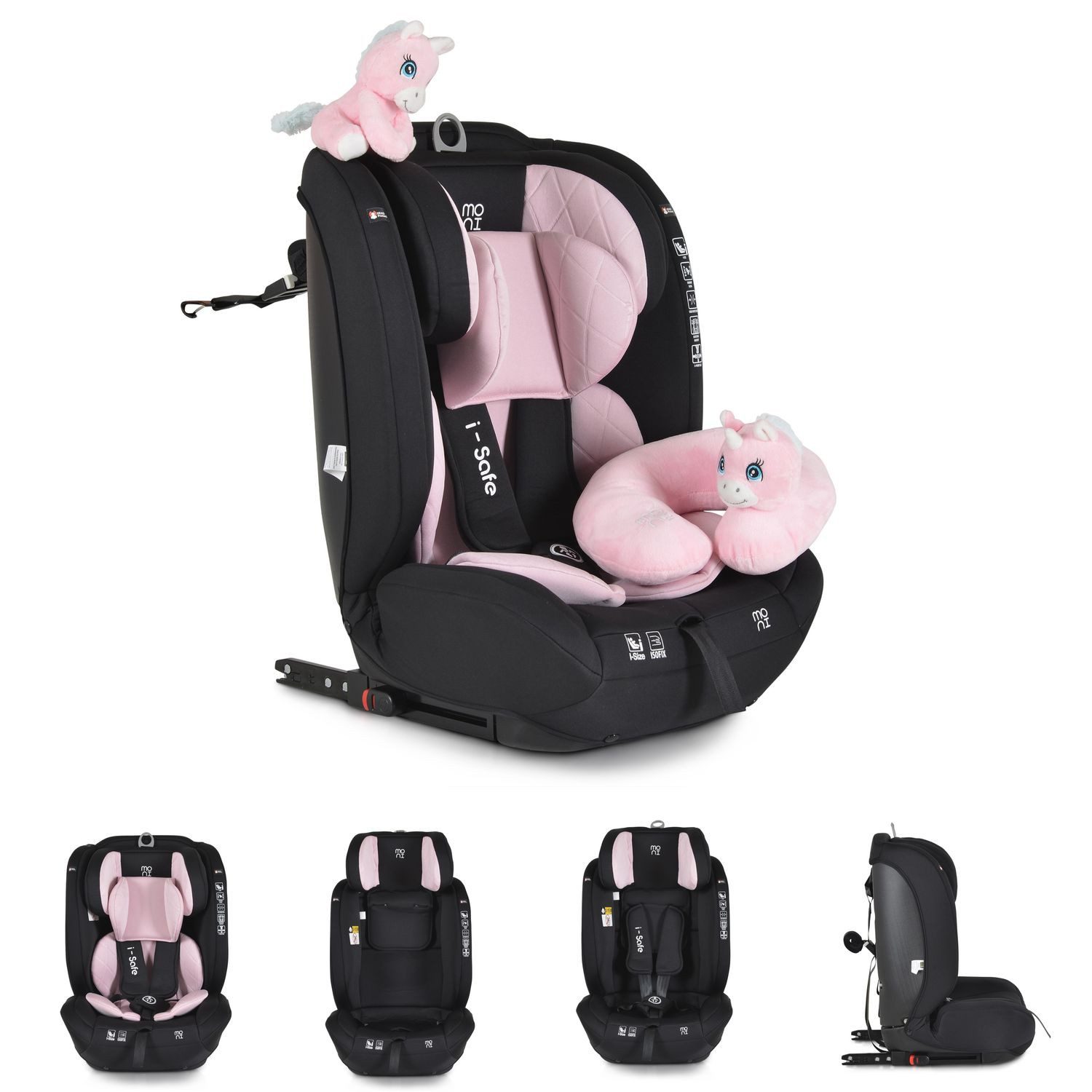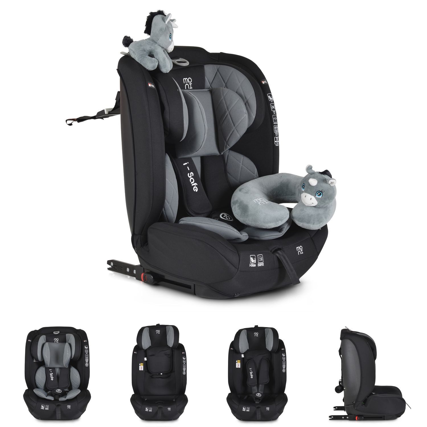 Der Kindersitz i-Size i-Safe von Moni ist für Kinder mit einer Körpergröße von 76 bis 150 Zentimetern geeignet. Er gehört zur Gruppe 1/2/3 und bietet Kindern ab 15 Monaten und einem Höchstgewicht von 36 Kilogramm die sichere Reise im Fahrzeug. Die Installation im Auto erfolgt schnell und einfach durch das Isofix-System. Ihr Kind wird mit dem 5-Punkt-Gurt mit weichen Polstern im Kindersitz gesichert. Die Kopfstütze lässt sich 13-fach verstellen, sodass Ihr Kind jederzeit bequem sitzen kann. Für zusätzlichen Komfort sorgen das weiche Kopf- und Körperkissen sowie das im Lieferumfang enthaltene Reisekissen. Ein dazu passendes Kuscheltier wird Ihr Kind auf seinen Reisen begleiten.