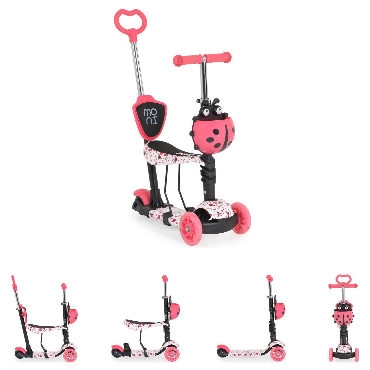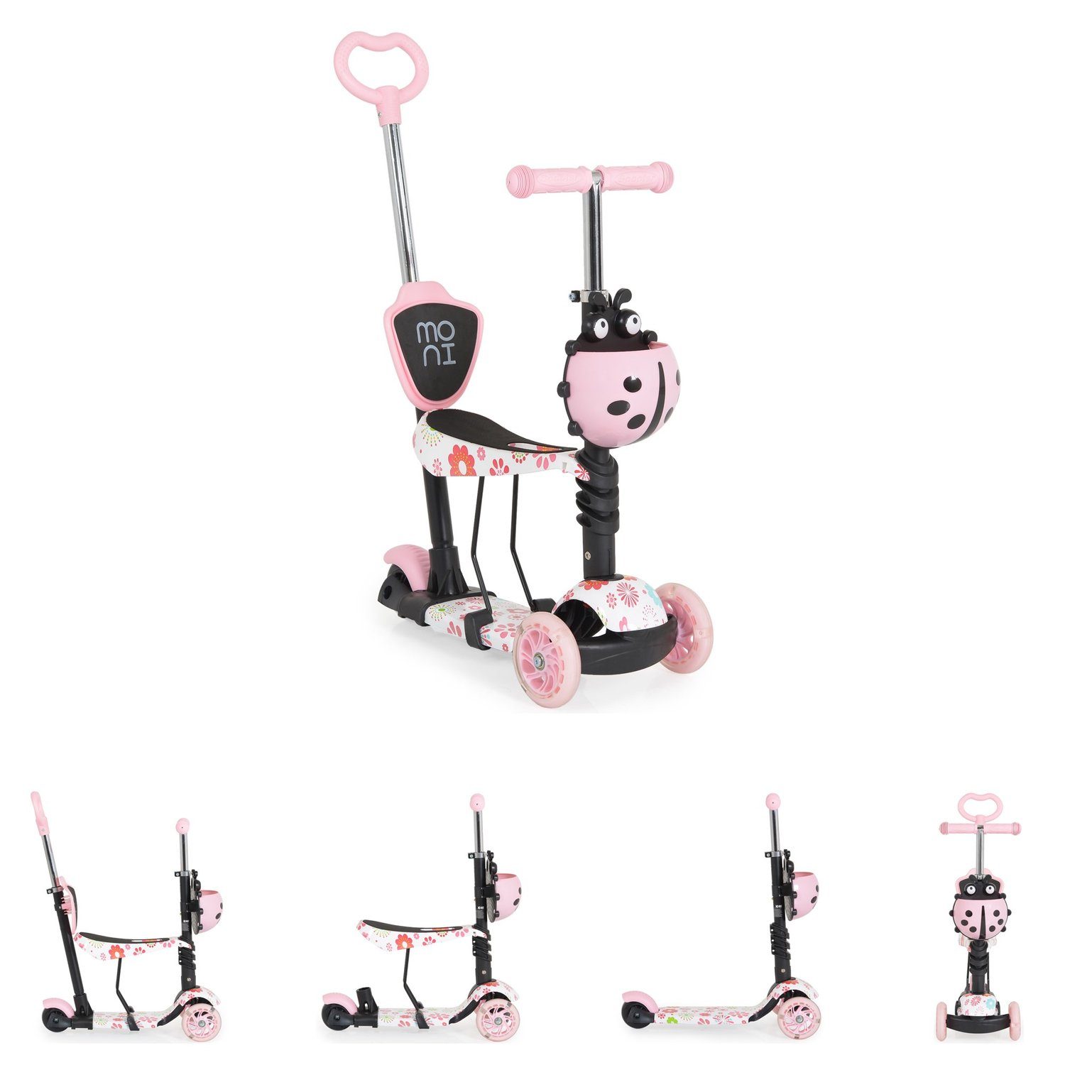 Besonderheiten Artikel Moni Kinderroller Lollipop 3 in 1 Schiebestange, Sitz, PU-Vorderräder mit LED:
