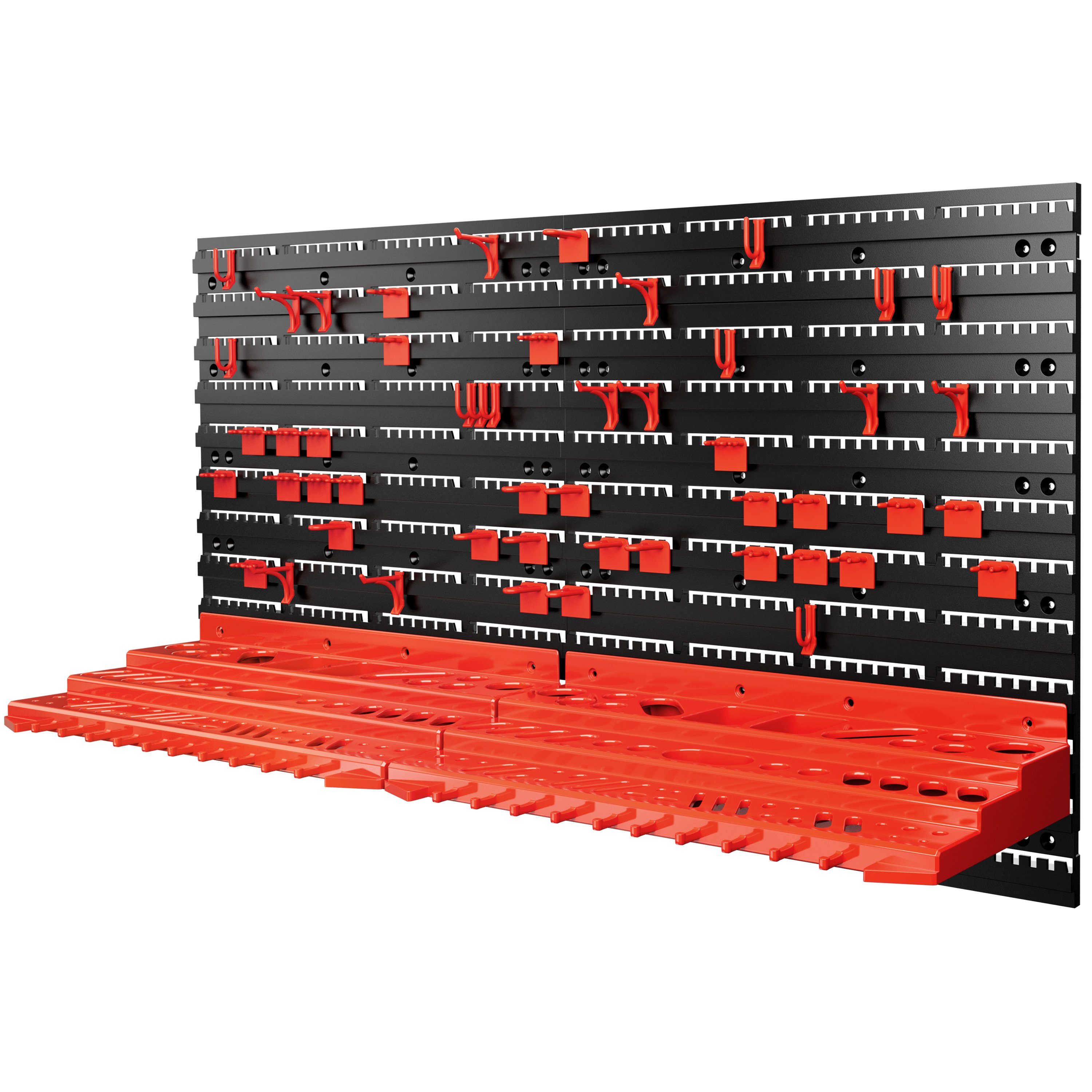 Die 54-teilige Lochwand von MONZANA besteht aus langlebigem und schlagfestem Polypropylen-Kunststoff und bietet die Möglichkeit Ihre gesamte Werkzeugsammlung übersichtlich zu ordnen. Die 50 Werkzeughaken bestehen aus je 10 O-Haken, Standard-Haken, J-Haken, VV-Haken und V-Haken auf. Neben den zwei Wandplatten bieten zwei großzügige Werkzeugablagen zusätzliche Ablagefläche.