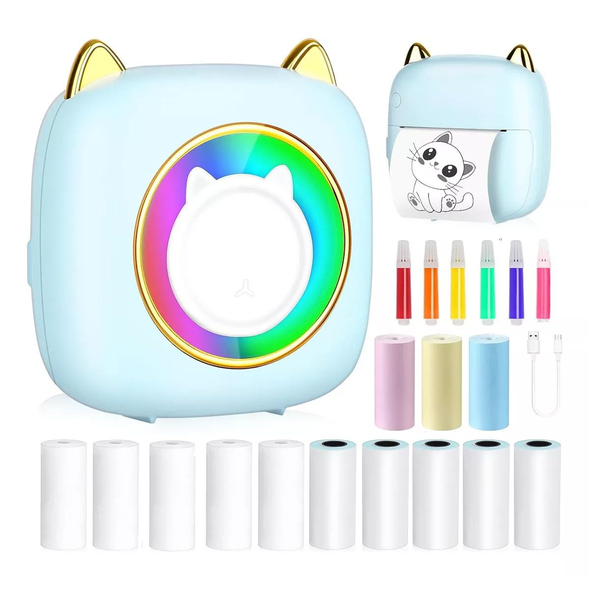 Unser tragbarer Mini-Drucker im niedlichen Katzendesign mit kleinen Ohren ist nicht nur praktisch, sondern auch ein echter Hingucker. Das integrierte LED-Licht wechselt automatisch in 7 Farben und sorgt für ein verspieltes Highlight, das besonders Kinder und kreative Nutzer begeistert. Mit seiner kompakten Размер von nur 3,1 x 3,3 x 1,8 Zoll passt er bequem in jede Tasche oder in den Rucksack. Ideal, um unterwegs Fotos, Texte, QR-Codes, Emoticons und vieles mehr auszudrucken – jederzeit und überall, ganz ohne großen Aufwand.