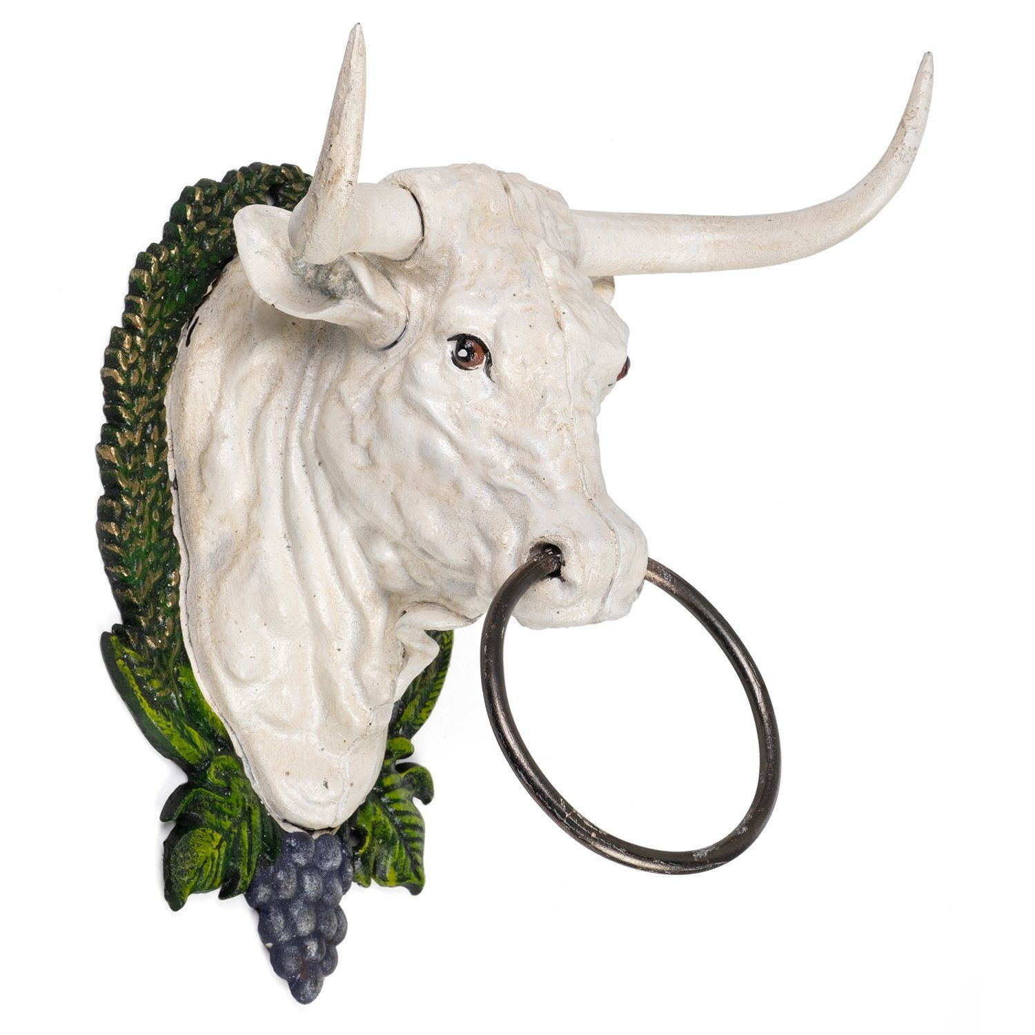 Origineller Handtuchhalter im Design eines Stierkopfs mit Ring zum Aufhängen von Hand- oder Geschirrtüchern - rustikaler Charme für Bad Küche Flur oder Gartenhaus Hergestellt aus massivem Gusseisen mit weißer Antik-Lackierung und von Hand bemalt - robust, langlebig und dekorativ für den Innen- oder geschützten Außenbereich Inklusive Ringhalter aus Metall für Handtücher - ideal als auffällige Wanddeko im Landhausstil oder als Geschenkidee für Tierfreunde und Vintage-Liebhaber Maße ca. 29 x 24 x 19 cm - das Gewicht von ca. 3,3 kg sorgt für Stabilität bei der Wandmontage - Lieferung ohne Montagematerial Vielseitig einsetzbar in Bad, Küche, Flur oder auf dem Bauernhof - ein echter Hingucker in Kombination mit rustikalem oder mediterranem Einrichtungsstil