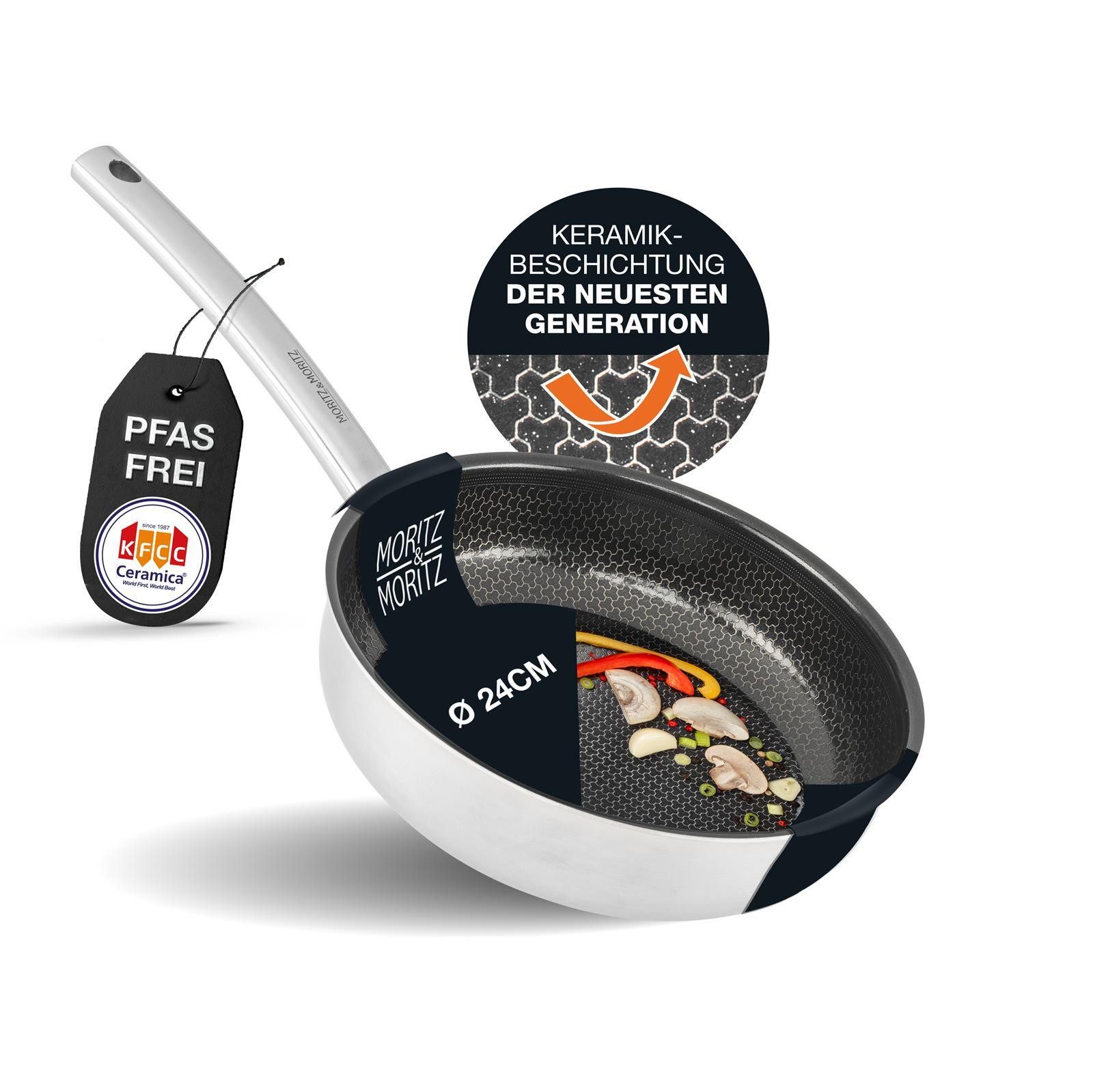 Die Moritz & Moritz Edelstahl Pfanne mit Deckel mit innovativer Wabenstruktur ist die Antwort auf Ihre kulinarischen Träume. Unsere Pfanne wurde entwickelt, um Ihnen ein ultimatives Kocherlebnis zu bieten. Das herausragende Всеinstellungsmerkmal dieser Pfanne ist die einzigartige Wabenstruktur aus Keramik im Inneren. Diese Beschichtung der neuesten Generation gewährleistet eine gleichmäßige Hitzeverteilung und verhindert, dass Ihre Speisen anhaften. Sie können sich auf perfekte Bratergebnisse verlassen, ohne lästiges Schrubben danach.