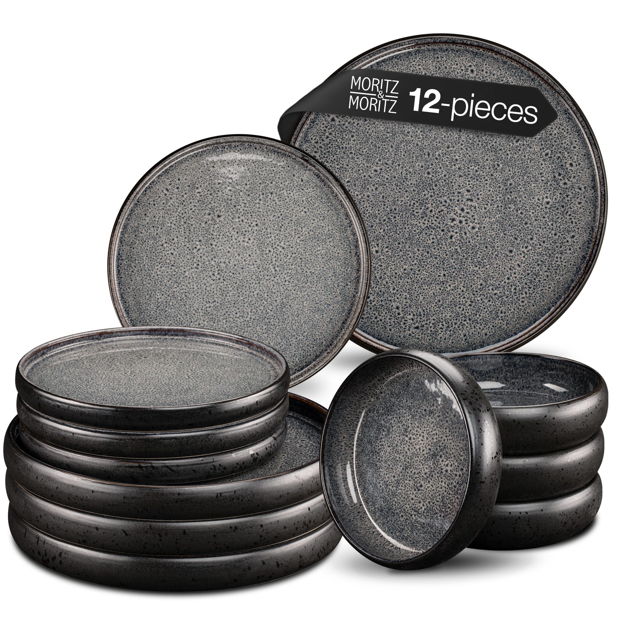 Das Moritz & Moritz 12-teilige Geschirrset in stilvollem Grau bietet alles, was Sie für ein elegantes Dinner oder den täglichen Gebrauch benötigen. Es umfasst 4 Speise-, 4 Dessert- und 4 Suppenteller aus robustem Steinzeug, die dank reaktiver Glasur jedes Stück zu einem Unikat machen.