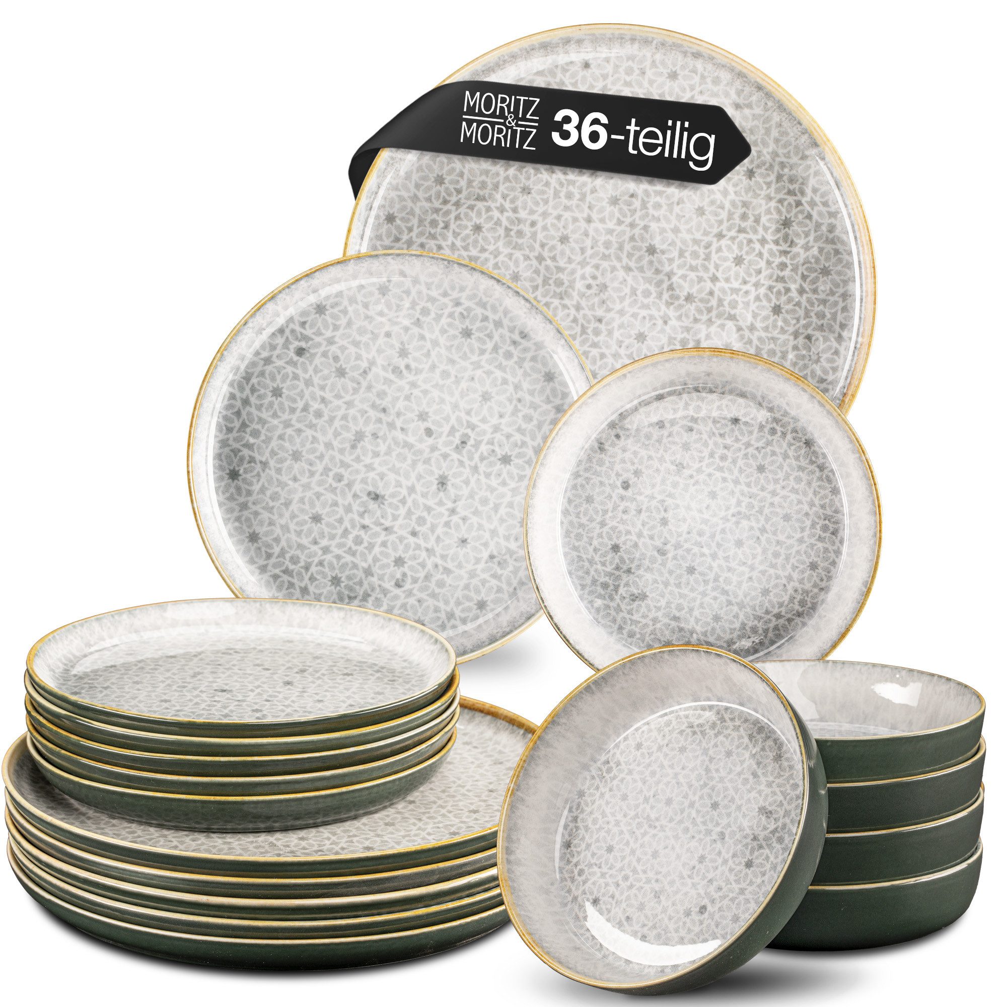 Moritz & Moritz Geschirr Terra Set 36-teilig Die spezielle Brenntechnik mittels reaktiver Glasur bewirkt den faszinierenden Look des Moritz & Moritz Geschirrs. So entstehen spektakuläre Farbverläufe, die immer wieder anders ausfallen und charakteristisch für diese Art der Verarbeitung sind. Damit ist jeder einzelne Teller garantiert ein Unikat und so einzigartig wie Sie selbst. Im edlen Geschenkkarton ist das Kombi-Geschirr von Moritz & Moritz auch bestens als Geschenk oder Mitbringsel geeignet. Zu Weihnachten, Geburtstagen, Hochzeiten oder anderen besonderen Anlässen. Durch die reaktive Glasur ist jeder der massiven Teller ein Unikat und setzt Ihre Mahlzeit elegant in Szene. Egal zu welcher Gelegenheit: Zum Abendbrot, Dinner mit Freunden, Frühstück oder Brunch.