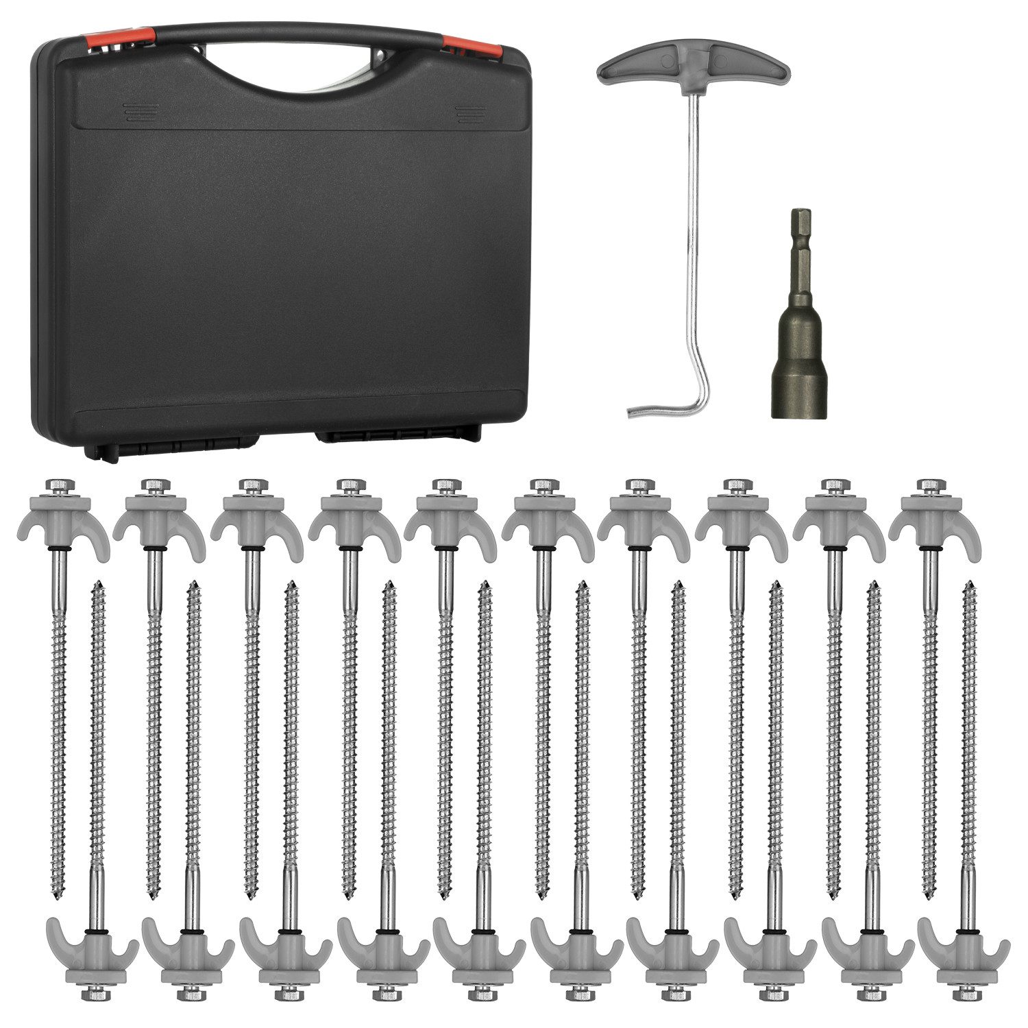 20,5 cm lange Schraubheringe mit Spezialkopf für maximalen Halt - mit einem Akkuschrauber und der mitgelieferten 13er Nuss sind die Heringe im handumdrehen reingeschraubt