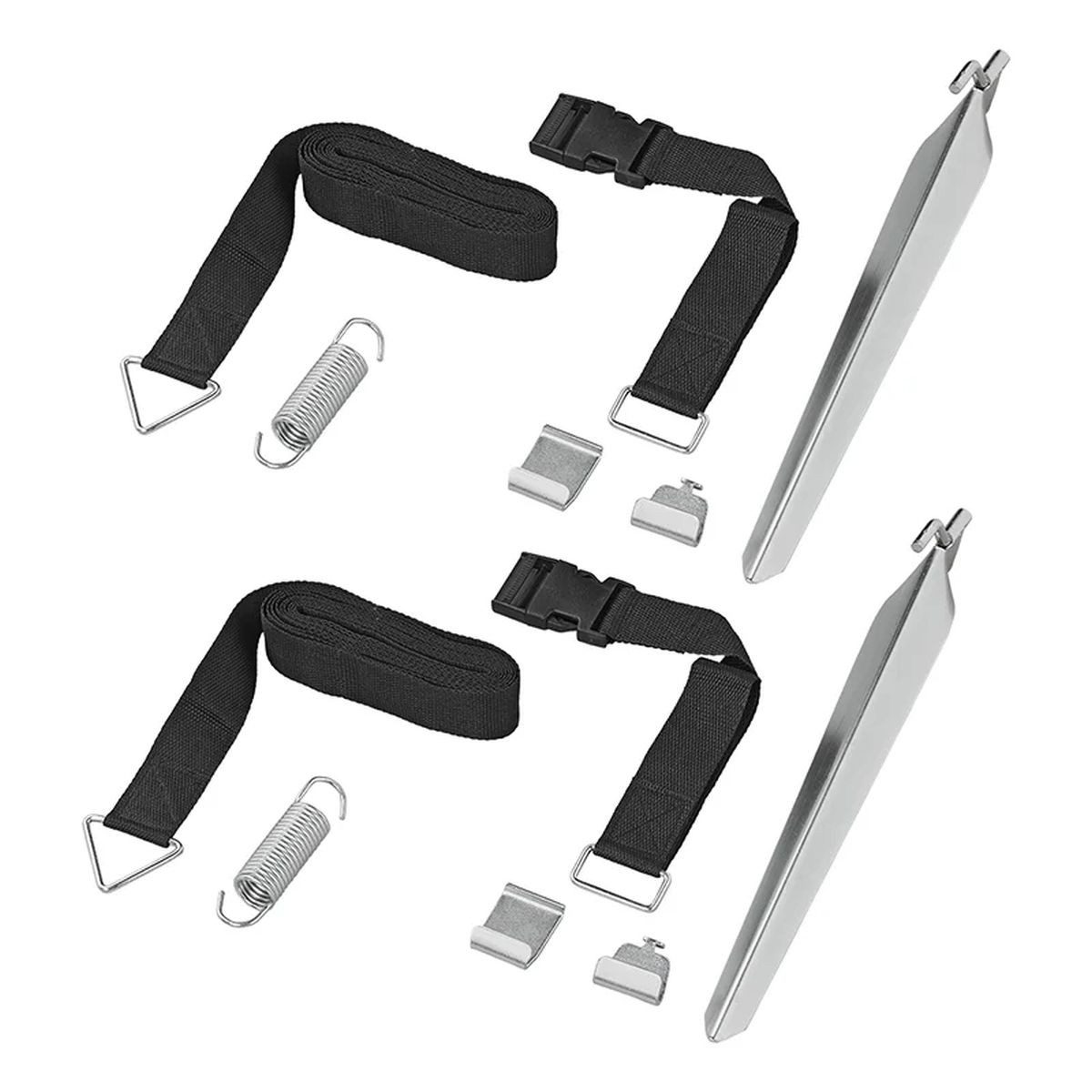 2x 4,5 cm Adapter für Kederschiene - 2x 4 cm Adapter für Stützfuß - 2x 3m x 4cm Nylongurte - 2x 50 x 4 cm Nylongurte mit Schnellverschlüssen - 2x 38 cm Sturmheringe - 2x 6 cm Feder