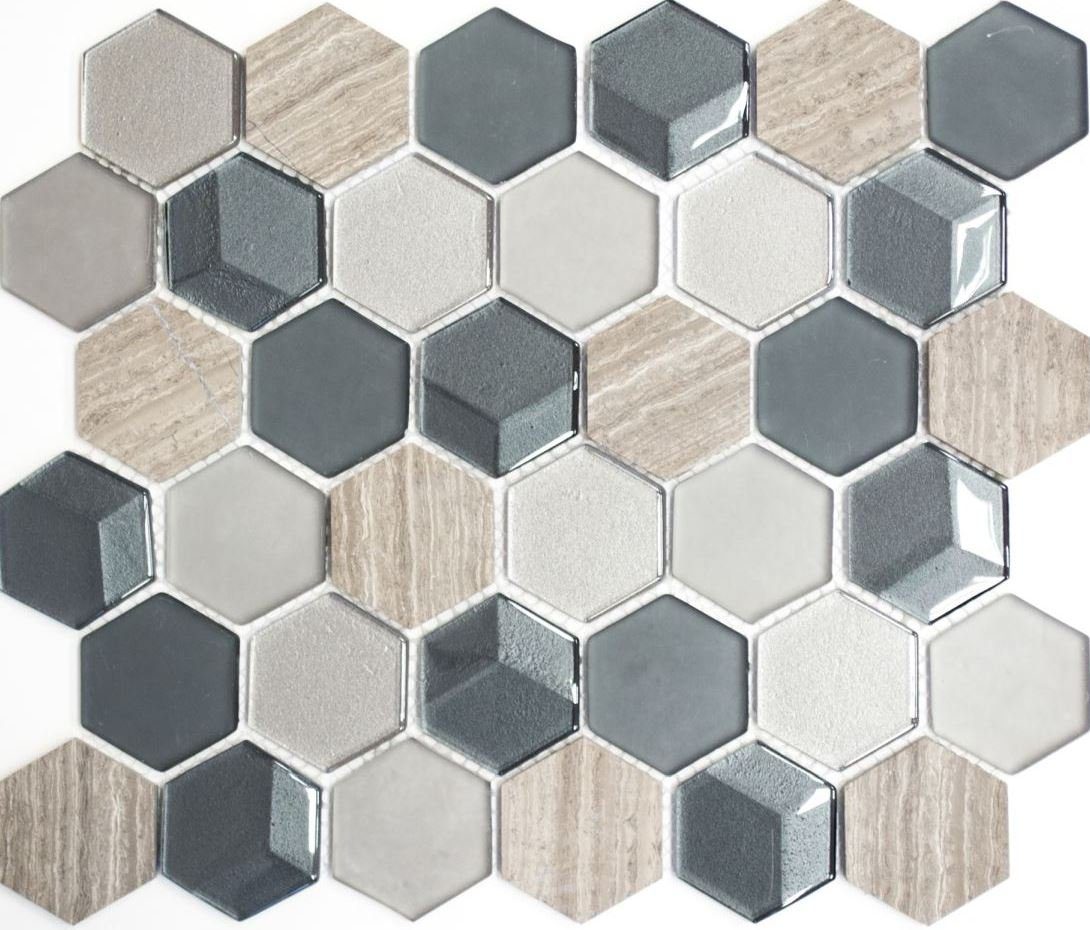 Naturstein Glasmosaik Mosaikfliesen Hexagonal anthrazit hellgrau graubrau Streifen Fliesenspiegel Wandverkleidung Bad - MOS11D-22