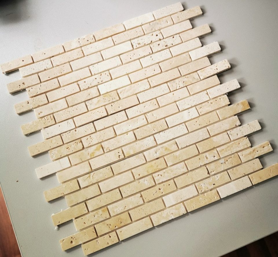 Описание товара (мы ещё работаем над переводом, извините за неудобство): Material: Travertin Typ: Mosaik Farbe: beige Optik: Verbundoptik Format: Rechteck Oberfläche: glänzend Steingröße in mm: 15x48x4 Mattenmaß in mm: 300x305