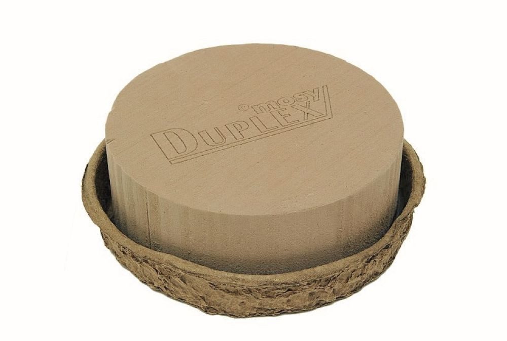 Runder Duplex Steckschaum mit Schale aus gepreßtem wasserdichten Altpapier. Die Steckmasse ist für Trockengestecke UND Nassgestecke verwendbar. Durchm. 24 cm.