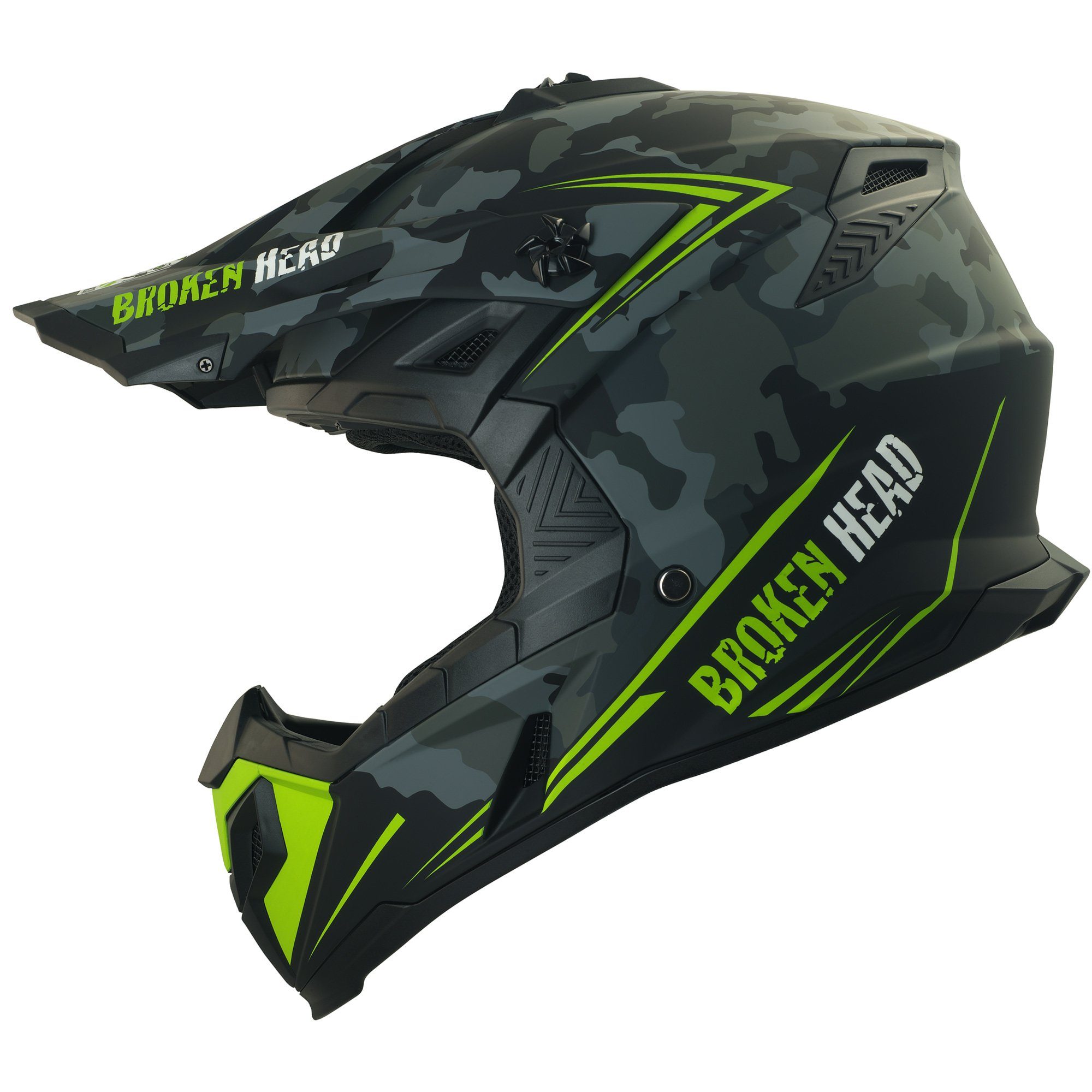 Bist Du ein furchtloser Offroad-Kämpfer? Dann passt der Broken Head Crosshelm Squadron Rebelution Camouflage zu Dir! Mit diesem Helm wirst Du automatisch Mitglied der Broken Head Elite, was bedeutet, dass Du ein echter rebellischer Rule-Breaker bist! Adrenalin und Freiheit sind Dir genauso wichtig wie uns. Langeweile ist nichts für Dich, Du musst Deine kämpferische Natur ausleben! Der Broken Head Squadron Rebelution Crosshelm wurde in einer speziellen Camouflage Optik angefertigt. Stell es Dir nur einmal vor: Du bist im Wald, auf Deiner Lieblingsstrecke. Das Wetter ist perfekt, es geht ein kleines Lüftchen. Auf deinem Kopf sitzt der Squadron Rebelution, Du bist eins mit dem Wald. Gänsehaut! Wenn Du Deine Stunts also in absoluter Ekstase durchziehst, darf eins nicht fehlen: Ein geschützter Kopf. Mit dem Squadron siehst du nicht nur gefährlich aus, er schützt Deinen Schädel auch noch gefährlich gut! Beim Crossfahren geht es teilweise echt hart her, deswegen musst Du auf Dich achten! Nicht nur Stürze sondern auch Schmutz, Steine oder Äste, die in die Luft gewirbelt werden, können Dich verletzen. Das speziell geformte Kinnteil schützt Dich bei einem Sturz und lässt Dir genug Freiraum zum Atmen, der Schirm dient als Sonnen- und Spritzschutz. Ein weiteres Feature, dass Dich einfach umhauen wird: Der Helm wiegt nur schlappe 1350 Gramm, Du wirst ihn kaum auf Deinem Kopf spüren. Mit den perfekt angeordneten Luftschlitzen hast du die optimale Luftzufuhr und Durchlüftung. Wir haben also alles versucht, um den optimalen Crosshelm für Dich zu entwerfen! Der Look und die Features sprechen für sich selbst! Hol Dir Deinen Crosshelm Squadron Rebelution Camouflage und lass alle wissen wie wild Du bist!