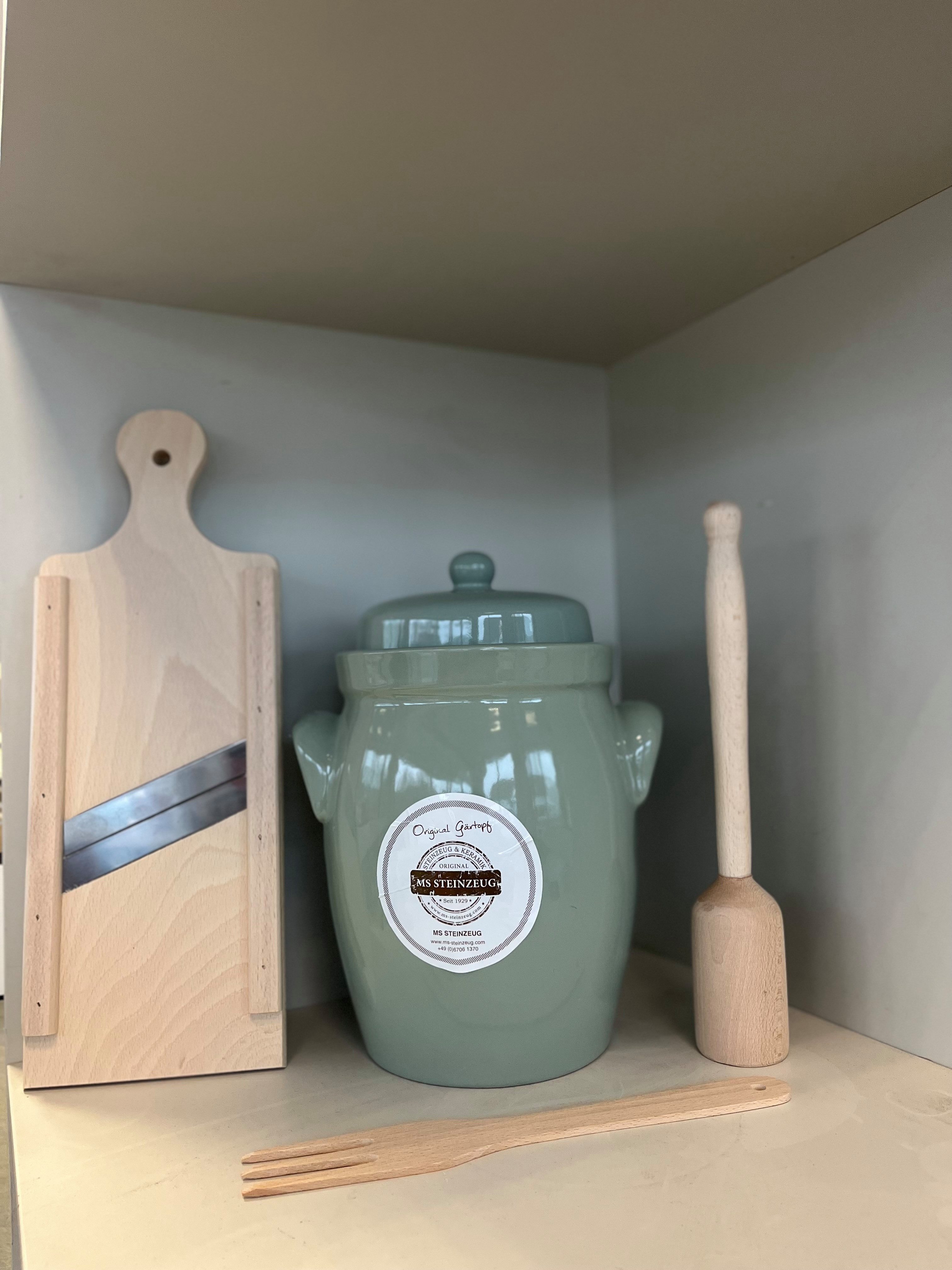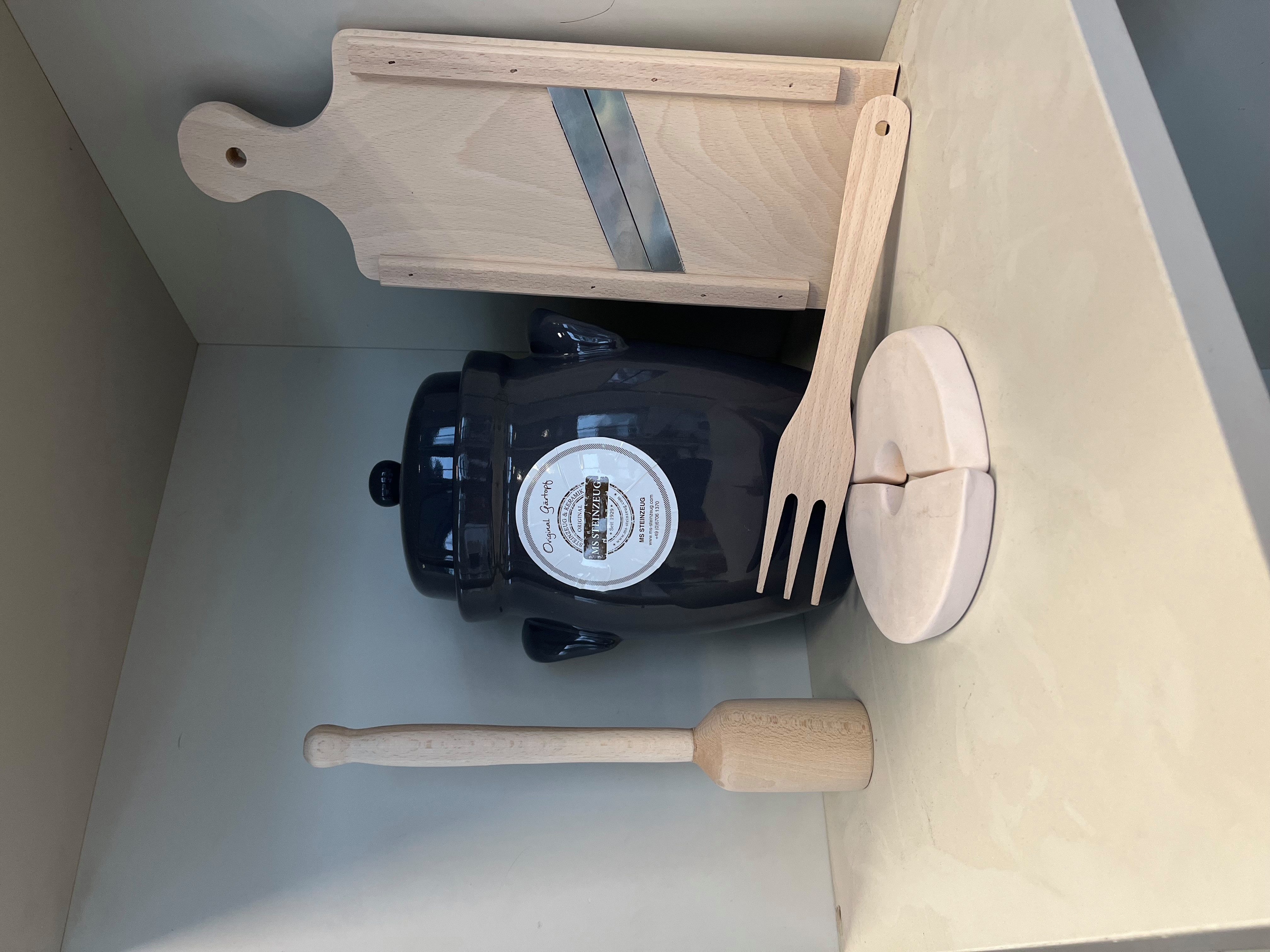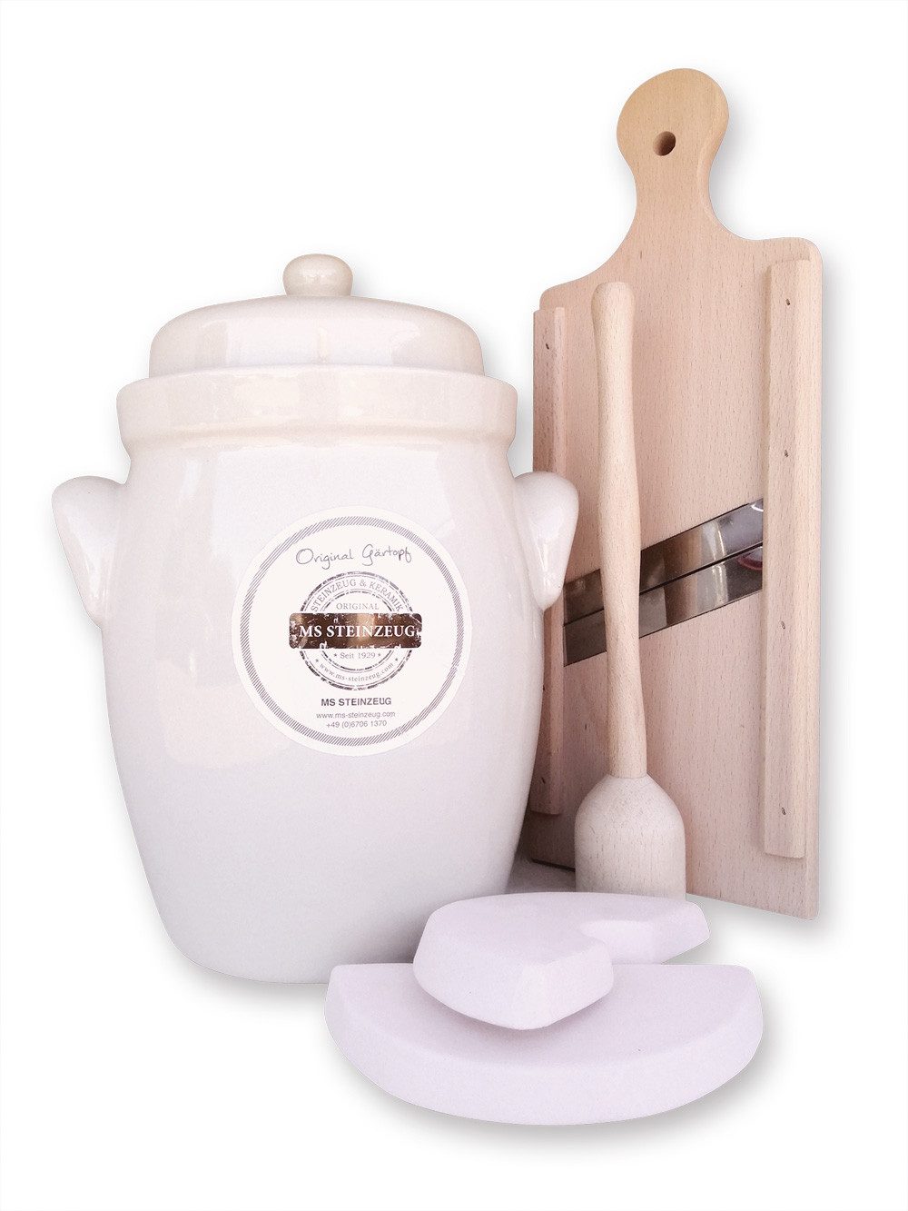 ANWENDUNG: Topf ausspülen, befüllen und die mitgelieferten Steine fest auf das Gemüse drücken. Deckel auf den Topf legen und die Wasserrinne mit Wasser füllen, wodurch der Topf luftdicht abgeschlossen ist, dadurch ist das Gsemüse auf natürlichste Art und Weise konserviert.