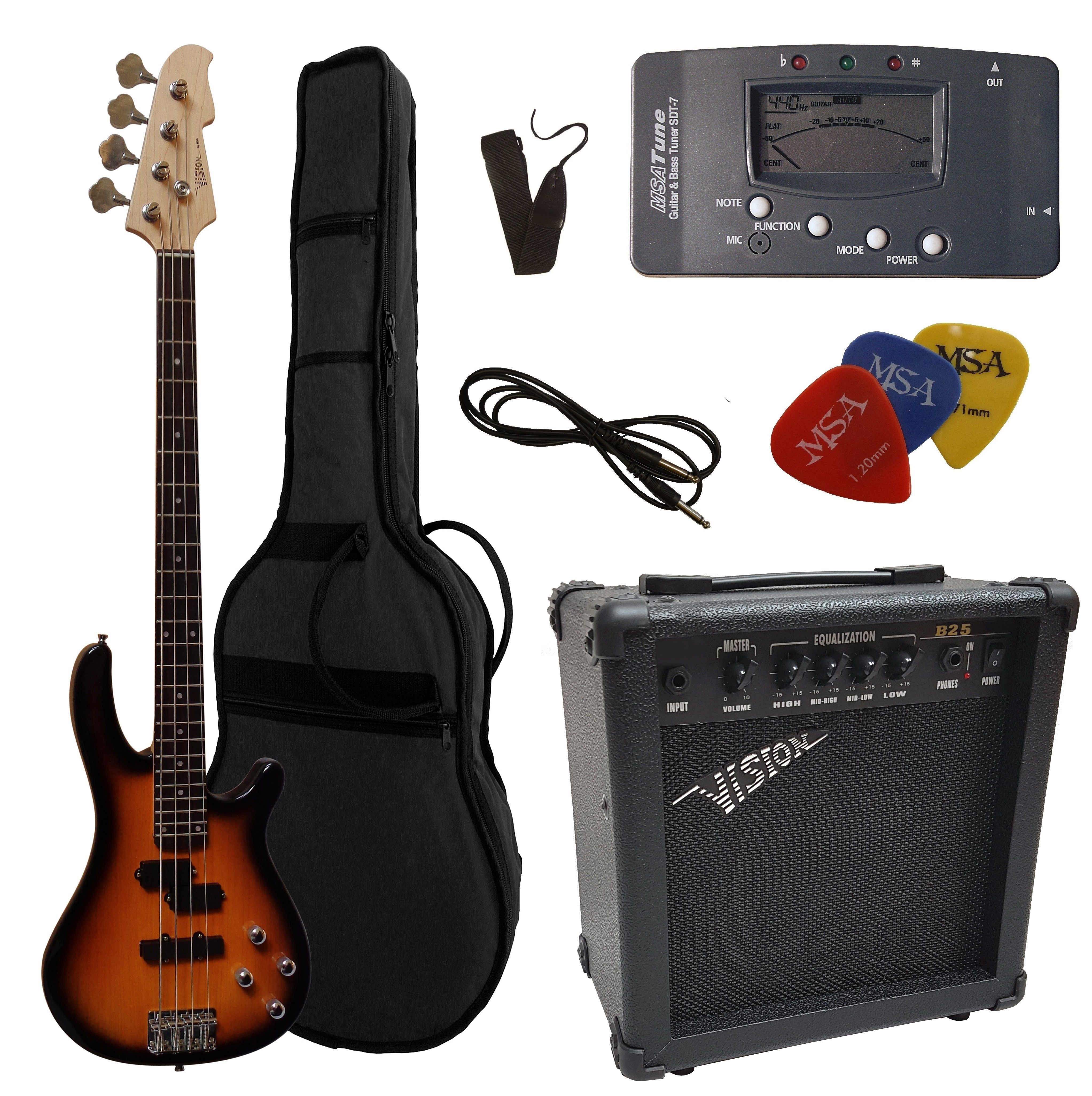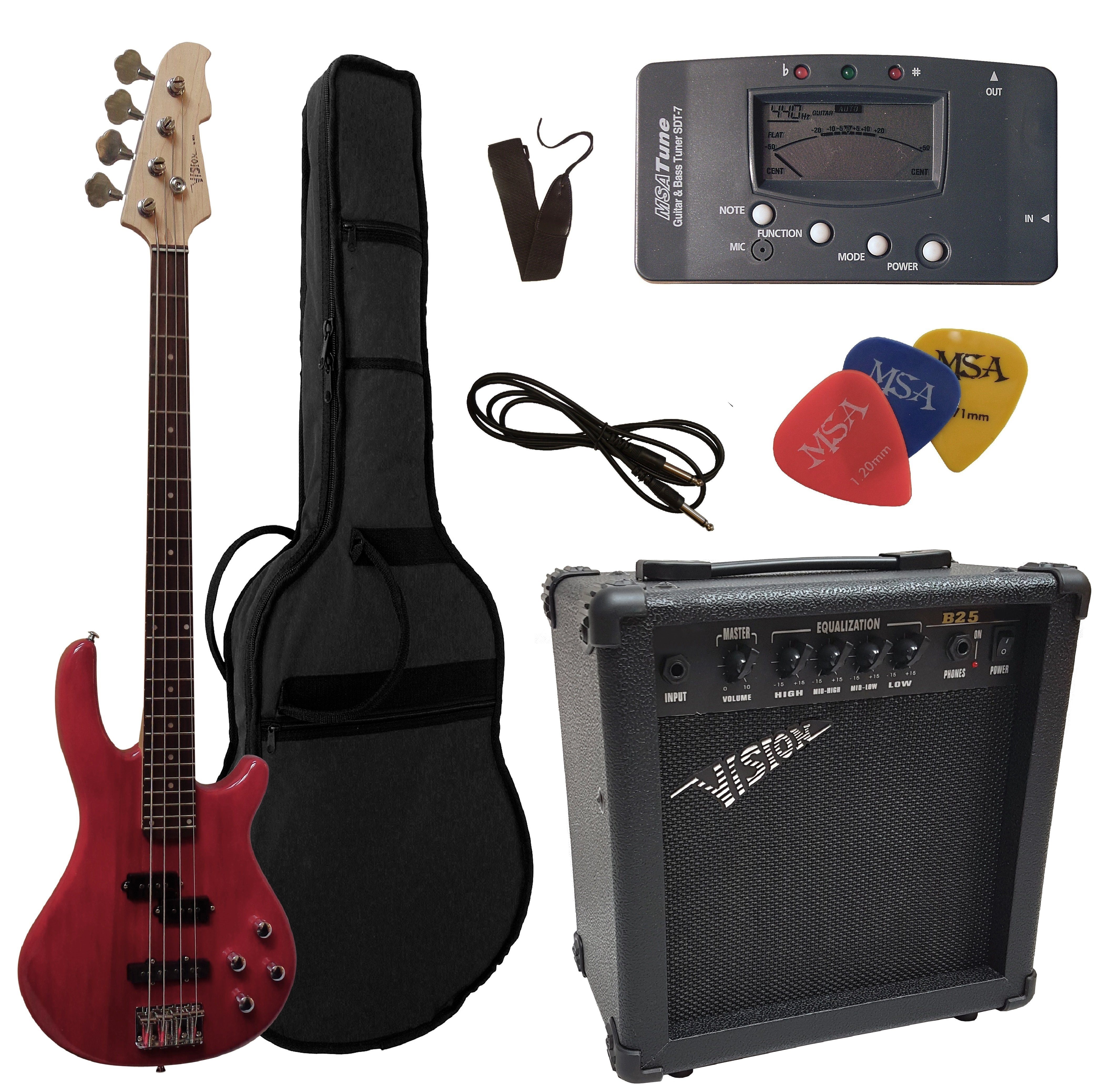 - E-Bass der Modellreihe J.B. - Farbe: nach Wahl - Mensur: 34" - hochglanzpolierter Holzkörper - 24 Neusilberbünde - Griffbrett: dunkles Holz, Palisander-Optik - Hals (Ahorn, geschraubt) - 4 Stahlsaiten - Endknopf für Gurtbefestigung - Offene Einzelmechaniken - PB Pick-Up - Doppeltonabnehmer und ein Einfacher - Long Scale Bass, Mape Neck & Wood Fingerboard - Chrome Plated Hatdware - Individual Covered Maschine Heads - 2 Volume, 2 Toneregler - einstellbarer Halsstab - spielbar in alle Stilrichtungen !!! - Verstärker (Bass Amplifier) B25: - Sinusleistung ca. 25 Watt-RMS - Musikleistung ca. 30 Watt - 8 Zoll / 16.5 cm Lautsprecher - 1 Gain Klinkereingang - Kopfhörer-Anschluss - 3 Band EQ für Höhen, Middle, Tiefen - für passive und aktive Tonabnehmer - Maße: ca. 31cm x 24,5cm x 33cm - Gewicht ca. 7kg