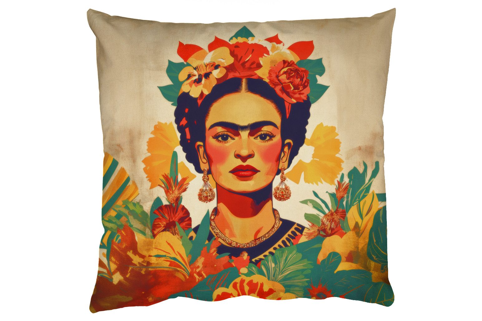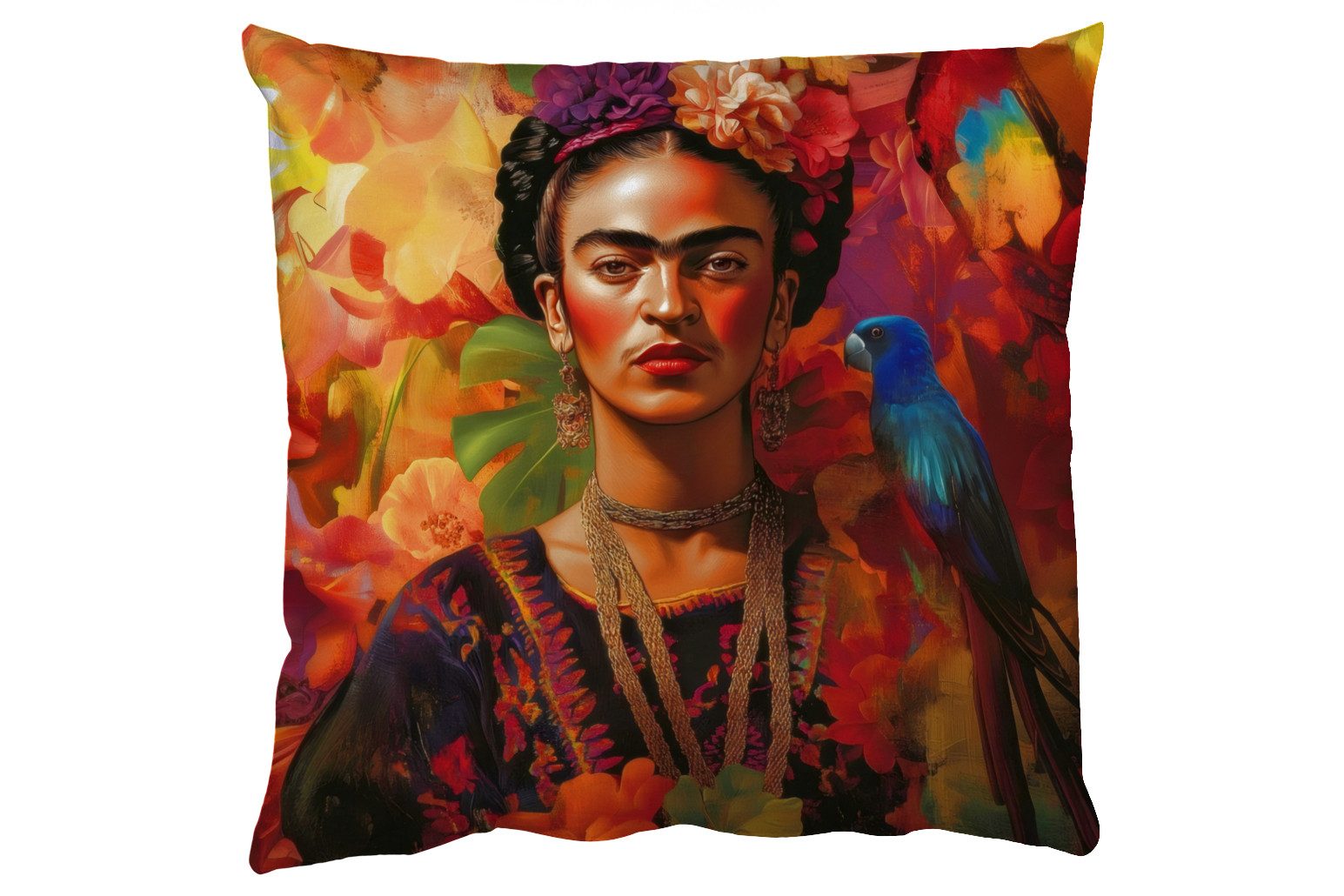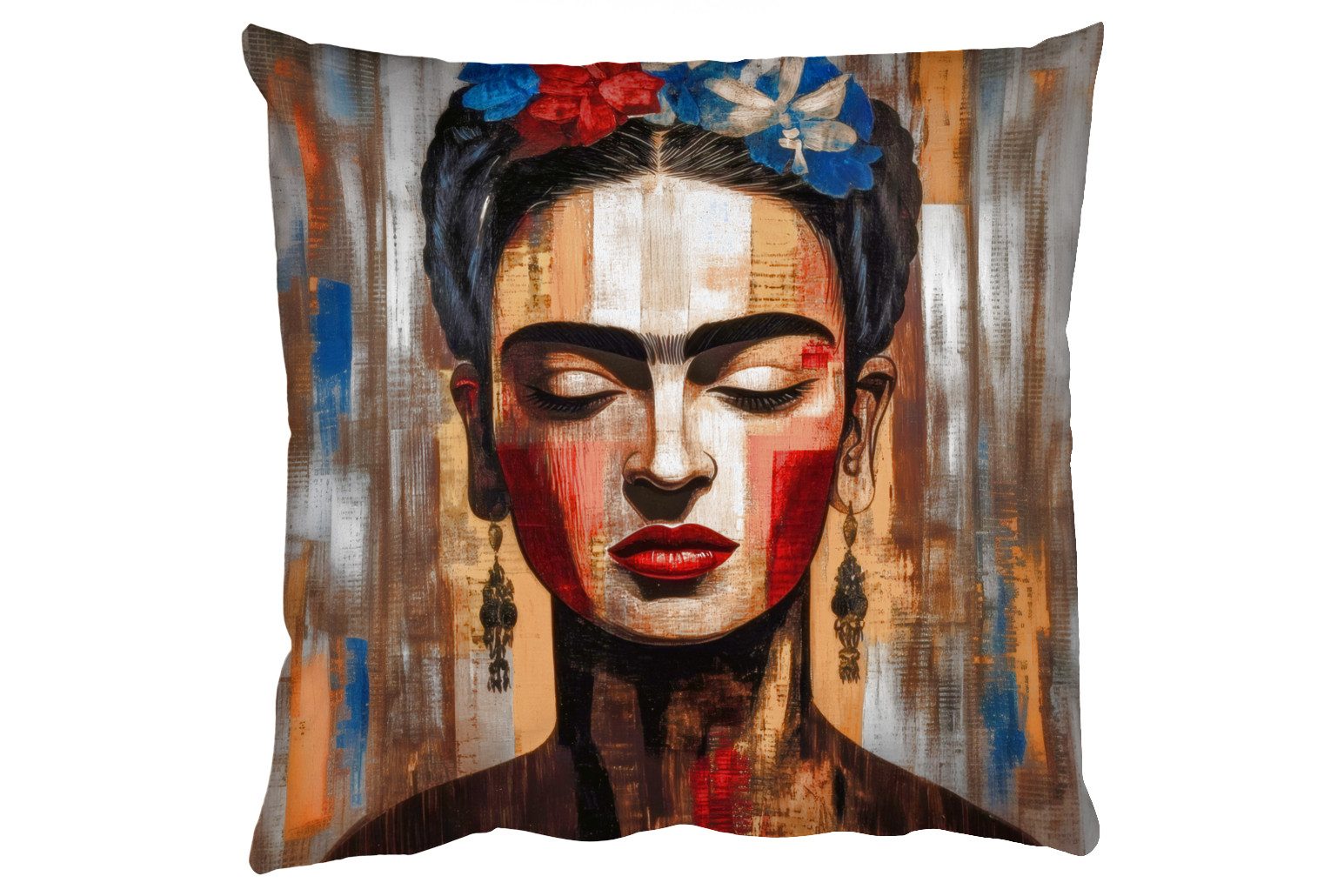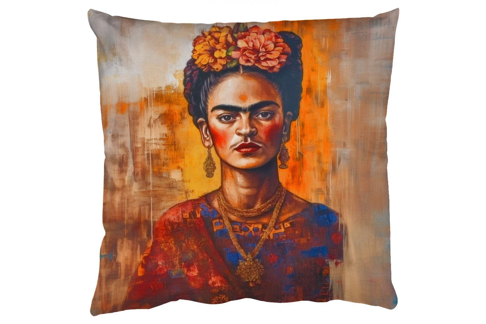Ein kraftvolles Porträt von Frida Kahlo mit Blumen im Haar, Schmuck und einem intensiven Blick. Der Hintergrund hat eine Mischung aus warmen und kühlen Tönen in einer malerischen Textur.