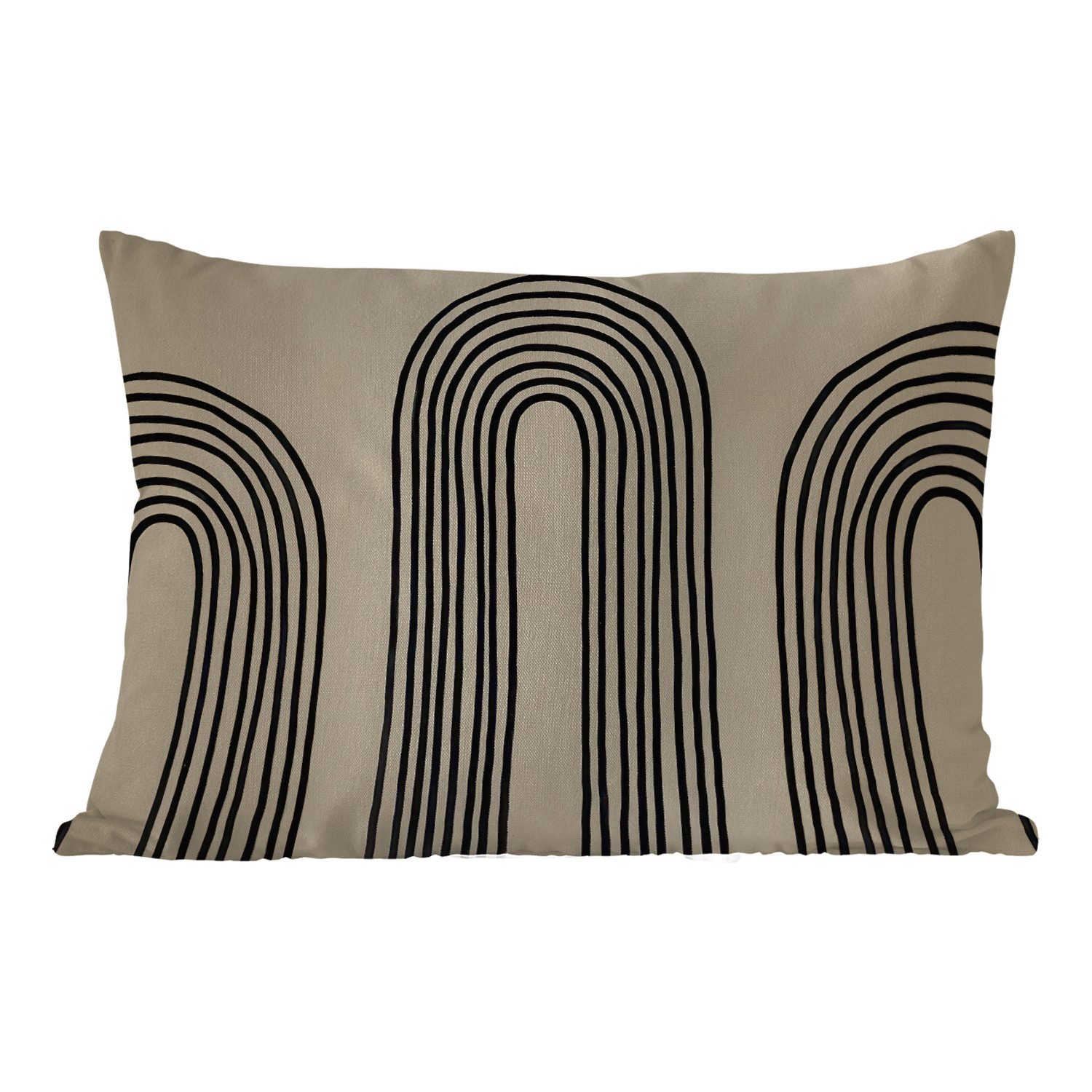 Dünne schwarze Linien bilden sich wiederholende Bogenformen, die wie stilisierte Regenbögen gerade aufsteigen. Die Formen sind dicht und rhythmisch auf einem cremefarbenen Hintergrund angeordnet.