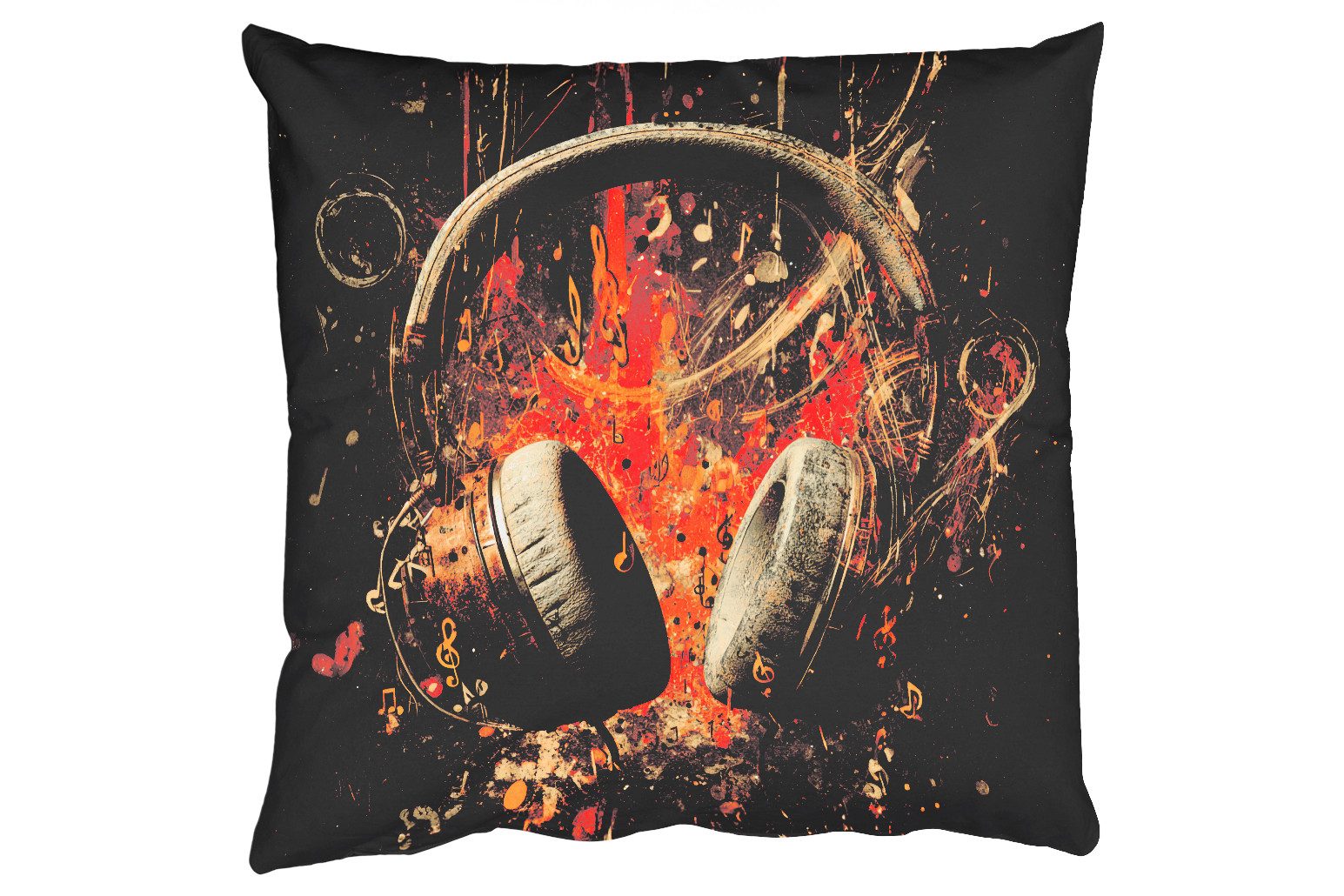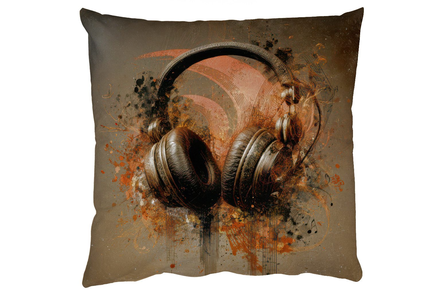 Bild von robusten Kopfhörern, umgeben von Musiknoten und dynamischen Pinselstrichen in Braun, Orange und Creme. Die Komposition ist kraftvoll und energiegeladen, als ob die Musik buchstäblich aus dem Bild strömt. Der dunkle Hintergrund unterstreicht das feurige Herzstück.