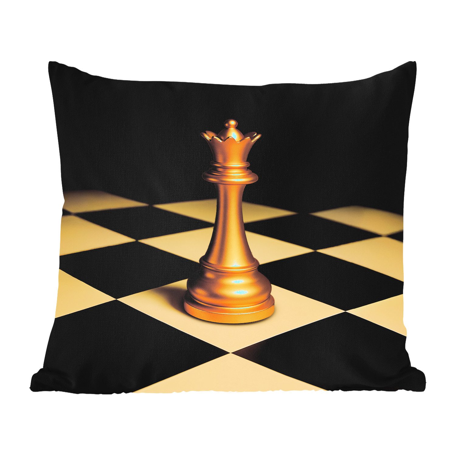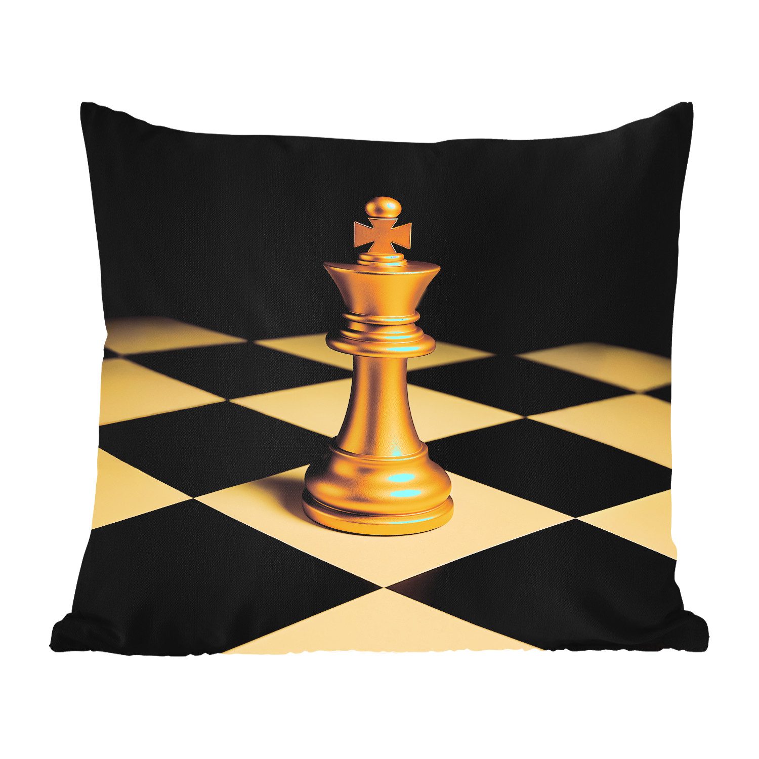 Eine elegante goldene Schachfigur steht auf einem klassischen schwarz-weißen Schachbrett, umgeben von einem dunklen, minimalistischen Hintergrund.