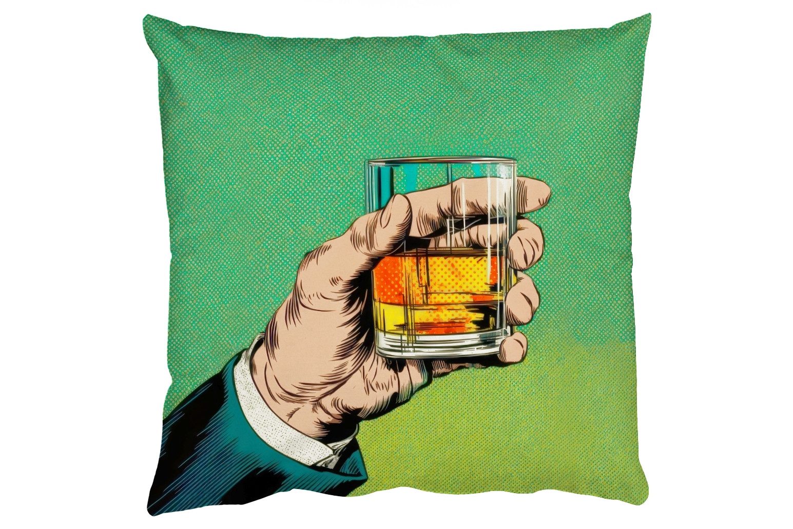 Eine Hand im Anzug hält ein Glas Whisky vor einem strukturierten, grün-gelben Hintergrund im Comic-Stil.