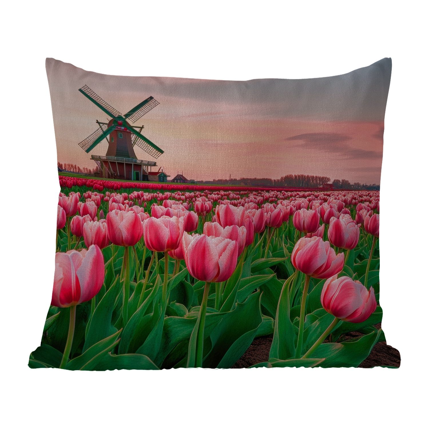 Ein weites Feld voller rosa Tulpen erstreckt sich in Richtung einer traditionellen Windmühle, die sich stolz gegen den bunten Abendhimmel abhebt. Die untergehende Sonne malt warme Rosa- und Orangetöne in den Himmel, während die Tulpen in voller Blüte stehen. Eine typisch niederländische Landschaft voller Gelassenheit und natürlicher Schönheit.