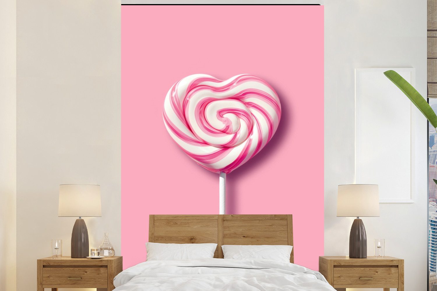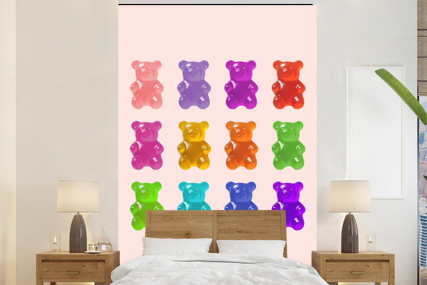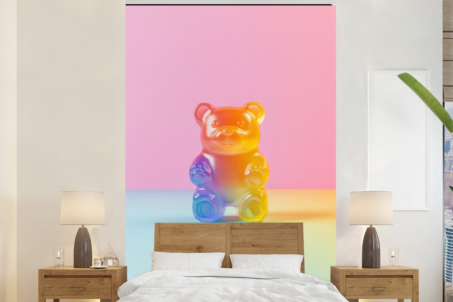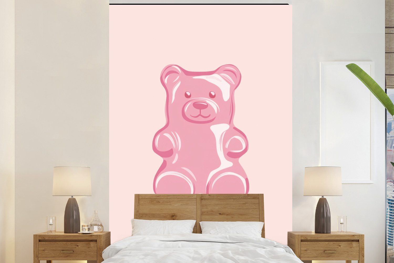 Ein großer, rosafarbener Gummibär, der auf einem weichen, cremefarbenen Hintergrund abgebildet ist. Die einfachen Details und die glänzende Textur unterstreichen seinen verspielten und einladenden Charakter. Ein perfektes Symbol für Süße.Oberflächenstruktur | Matt |