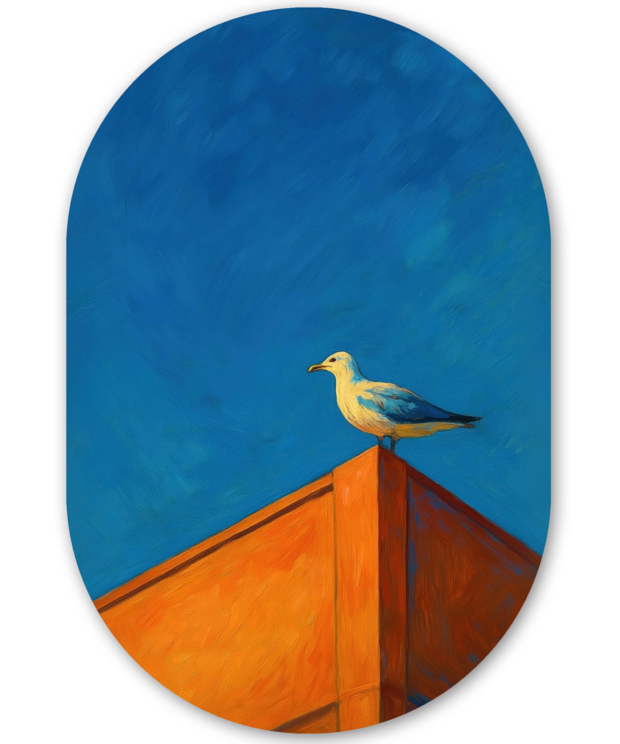 Eine weiße Möwe mit blauen Akzenten sitzt auf der Spitze eines orangefarbenen Gebäudes. Der Himmel im Hintergrund ist tiefblau und mit weichen Pinselstrichen gemalt.Kunstgenre | Modern, Natur, Tiere, Abstrakt, Kinderzimmer |