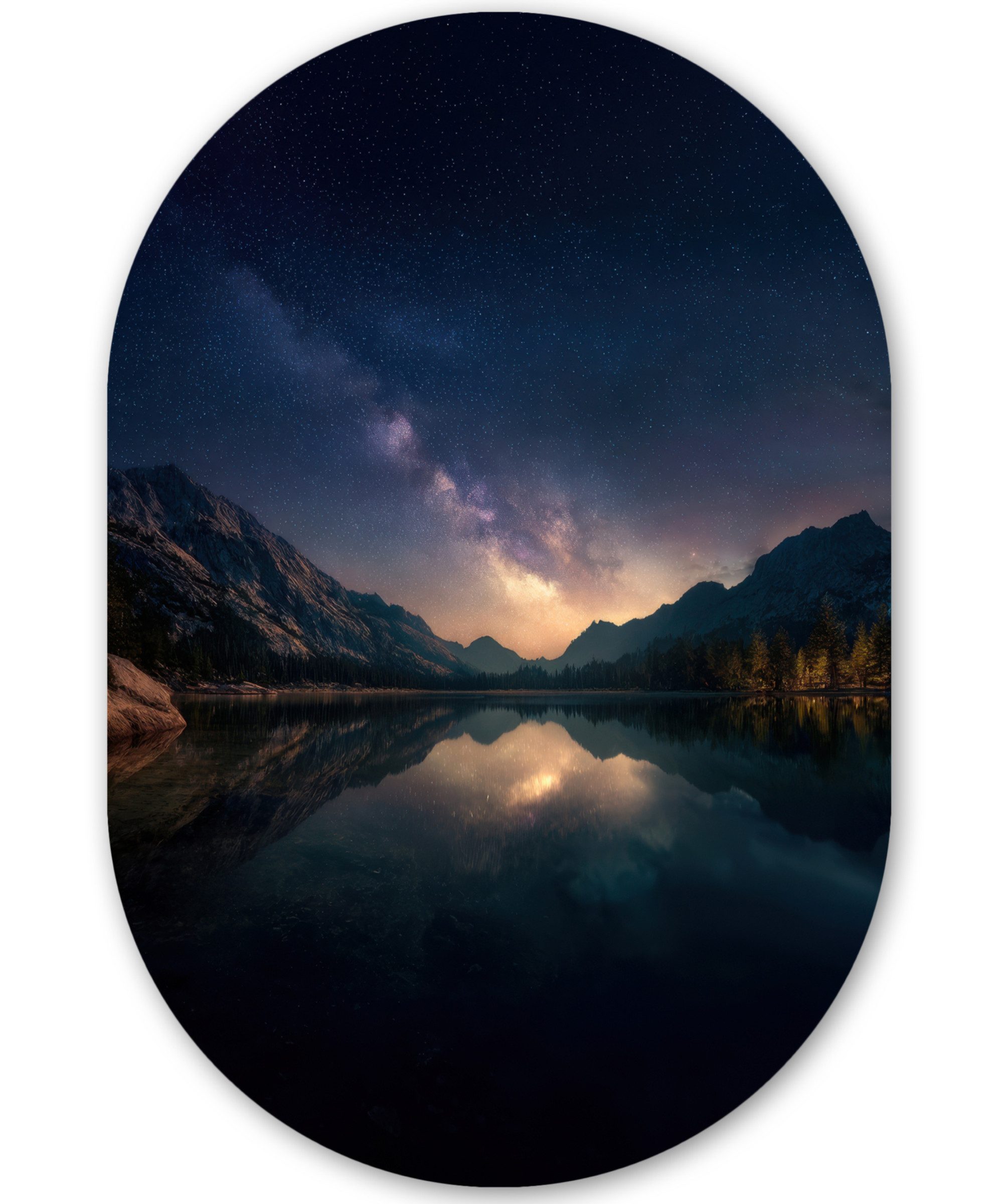 In einem kristallklaren See spiegeln sich majestätische Berge und die Milchstraße, während der Nachthimmel tiefblau leuchtet und am Horizont ein sanftes Licht aufblitzt.Kunstgenre | Modern, Natur, Tiere, Abstrakt, Kinderzimmer |