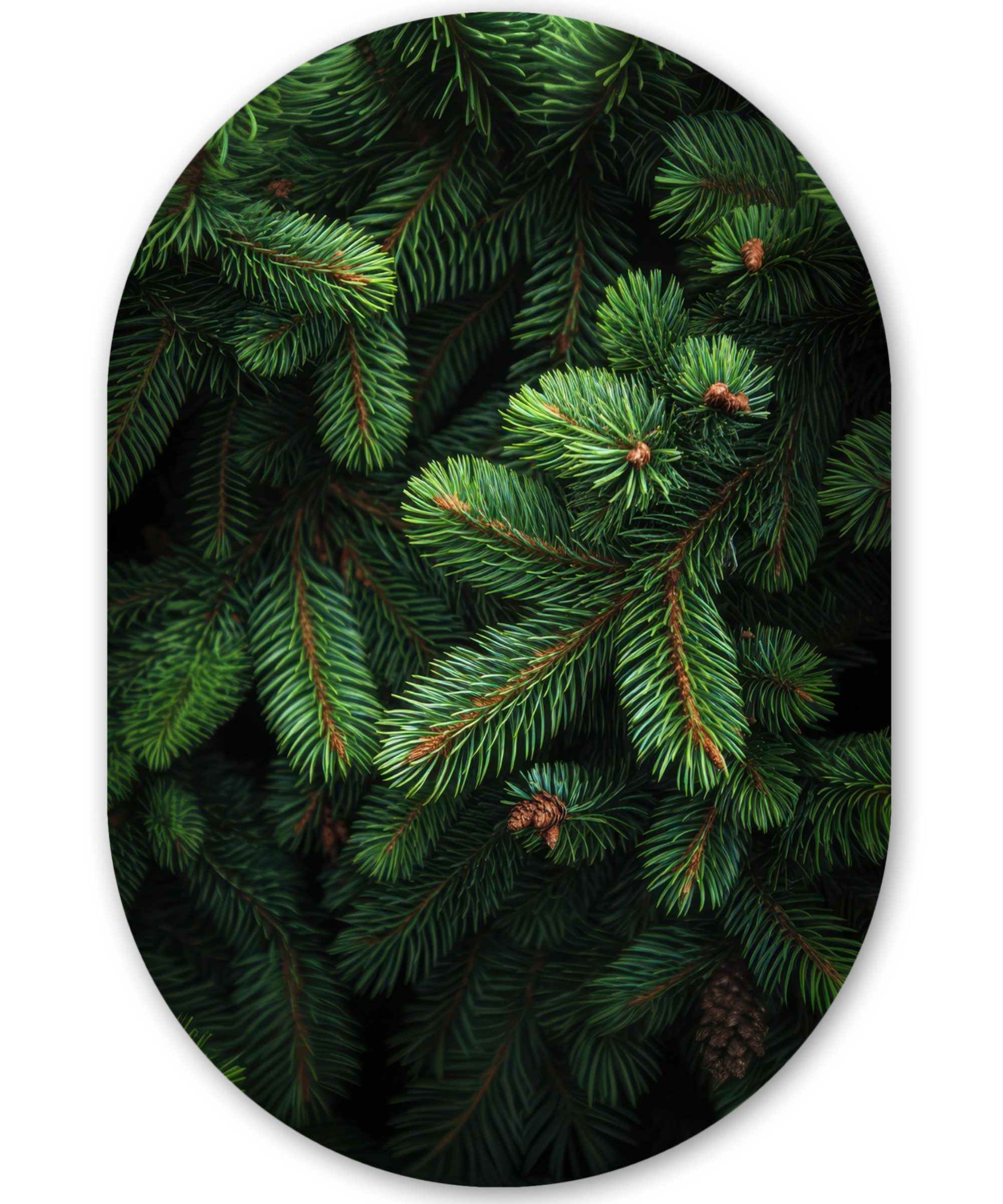 Ein kompakter Satz dunkelgrüner Fichtenzweige mit kurzen Nadeln. An den Enden sind kleine braune Knospen inmitten eines natürlichen Lichtspiels sichtbar.Kunstgenre | Modern, Natur, Tiere, Abstrakt, Kinderzimmer |