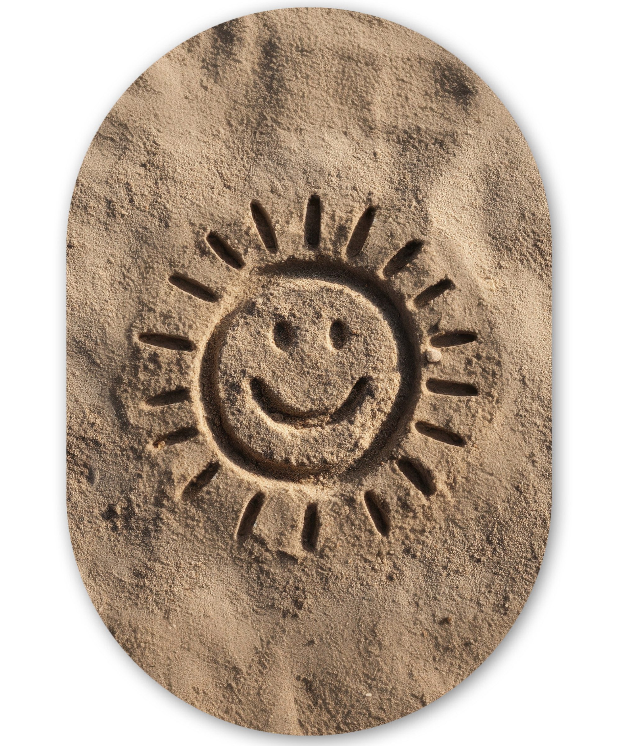 Ein lächelndes Gesicht mit Strahlen ist in trockenen Sand gezeichnet. Die Form des Sonnenstrahls wirkt verspielt und spontan.Kunstgenre | Modern, Natur, Tiere, Abstrakt, Kinderzimmer |