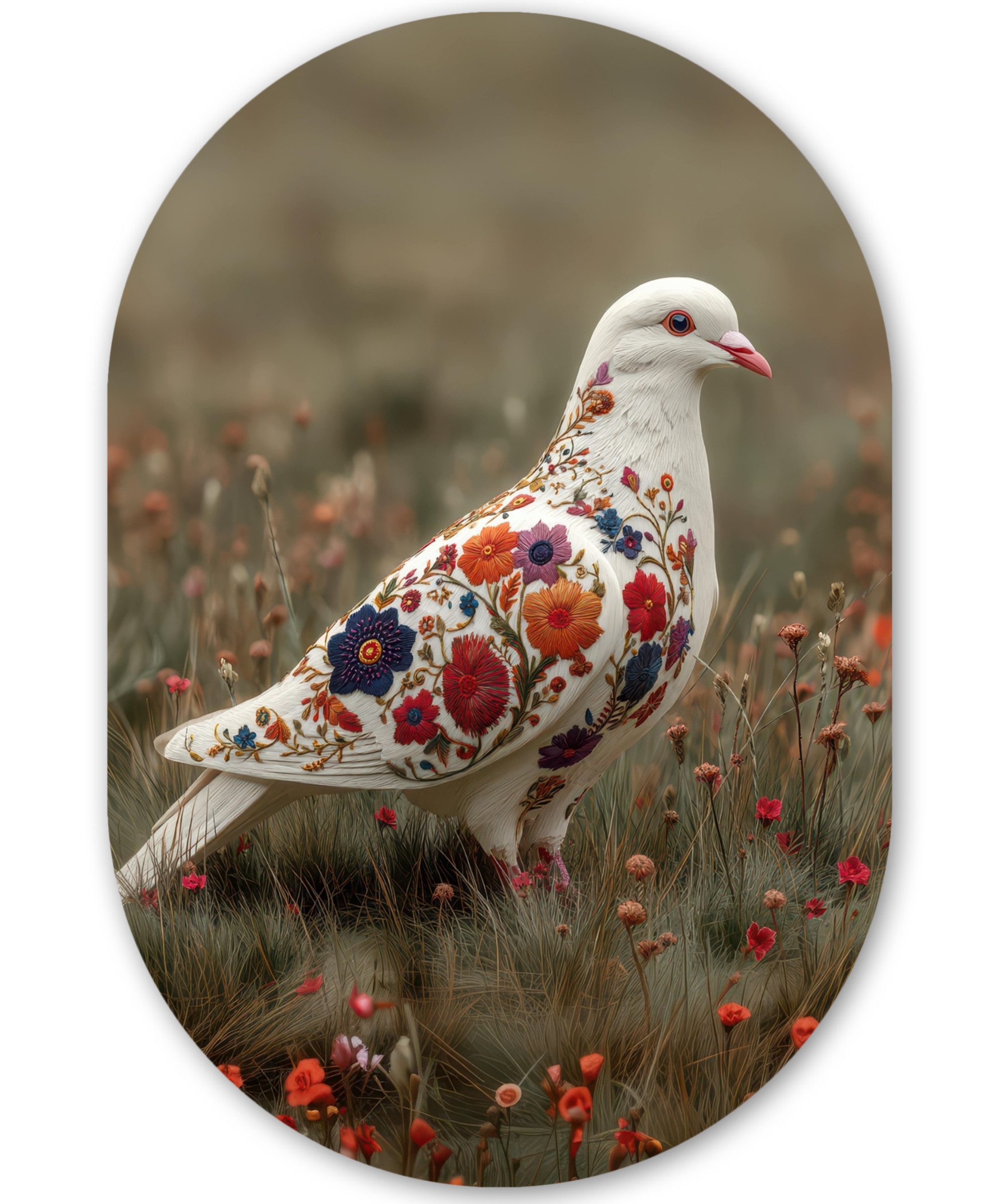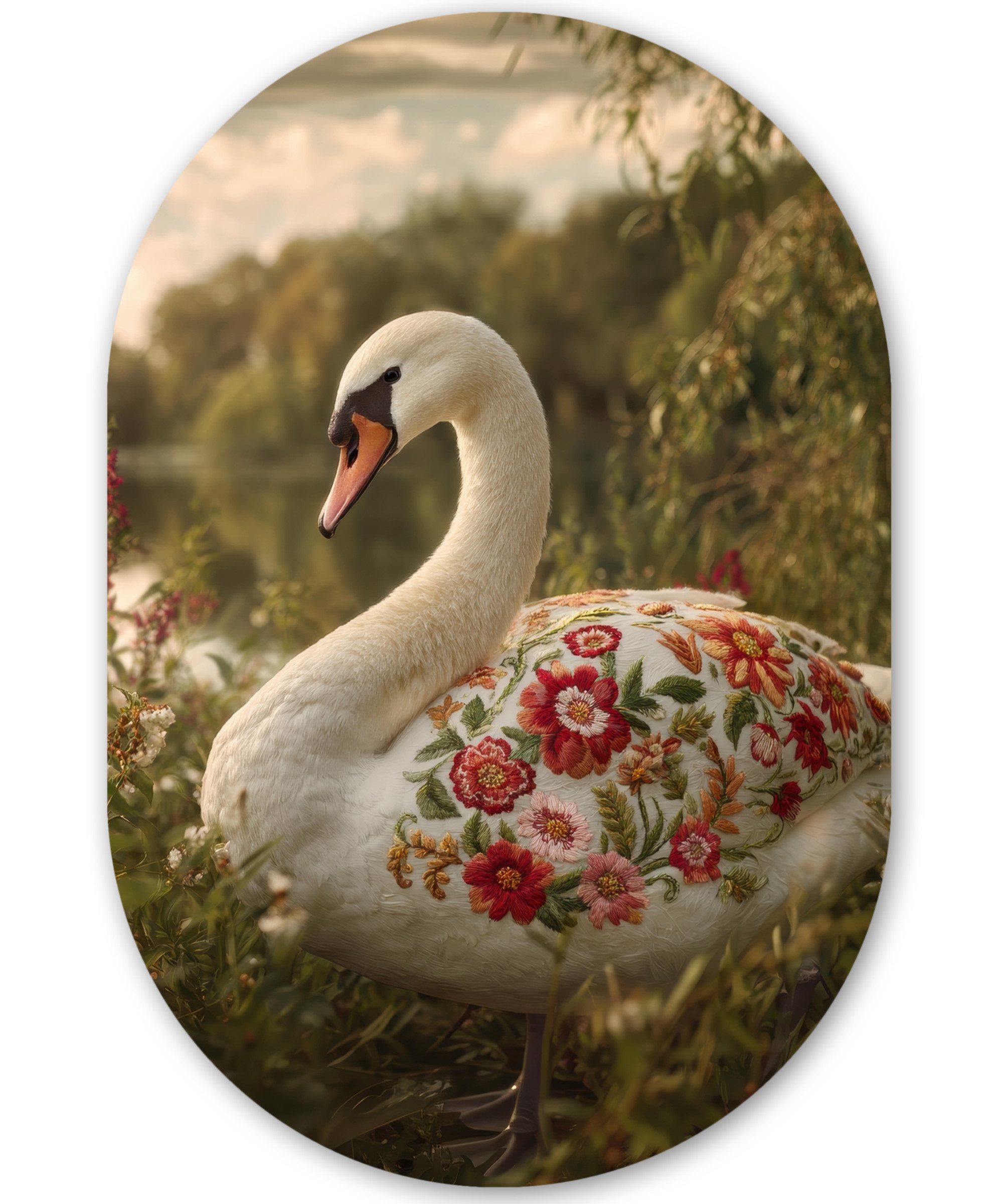 Ein weißer Schwan sitzt anmutig am Ufer eines Sees, umgeben von Blumen und Sträuchern. Auf seinem Rücken ist ein buntes Muster aus gestickten Blumen in Rot, Rosa, Gelb und Grün zu sehen. Die sanfte Beleuchtung und die natürliche Umgebung unterstreichen die märchenhafte Atmosphäre der Szene.Kunstgenre | Modern, Natur, Tiere, Abstrakt, Kinderzimmer |