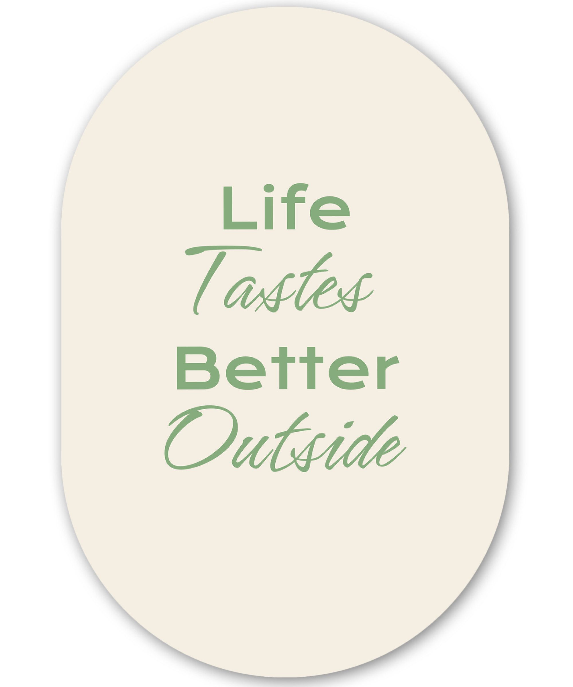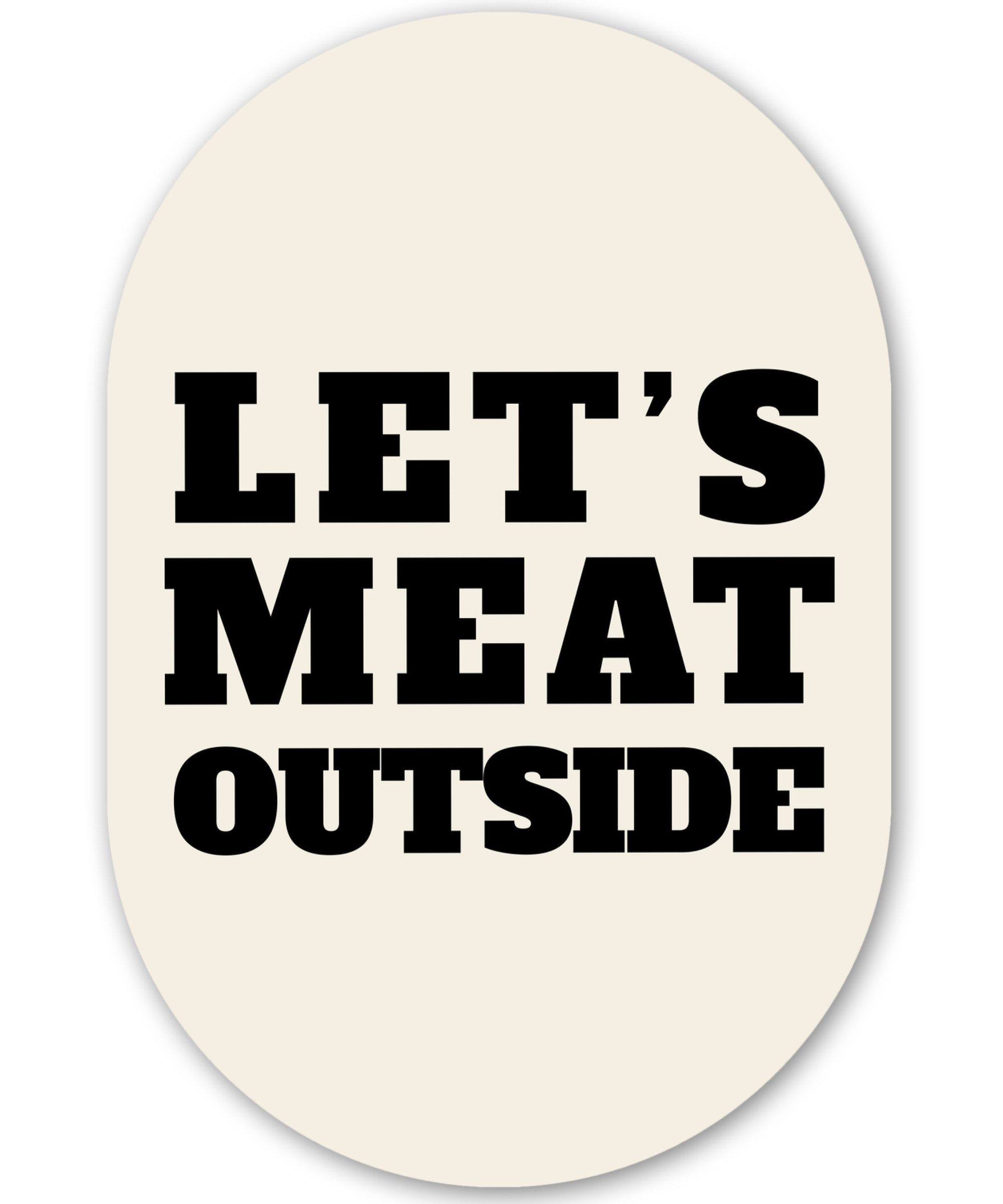 "LET'S MEAT OUTSIDE" steht in dicken schwarzen Blockbuchstaben auf einem hellbeigen Hintergrund. Das Wortspiel verbindet Humor mit Einladung.Kunstgenre | Modern, Natur, Tiere, Abstrakt, Kinderzimmer |