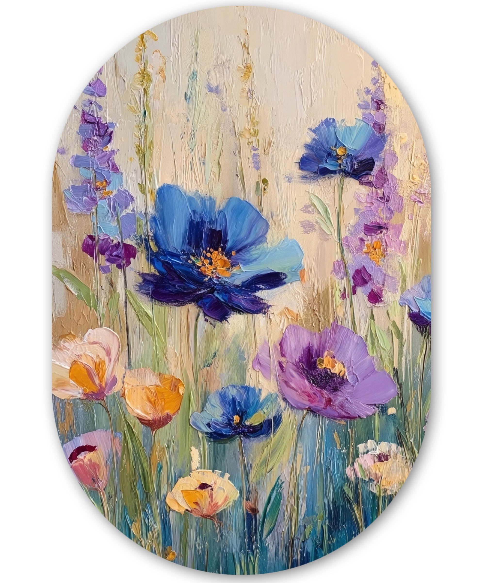 Ein Gemälde mit Wildblumen in Blau, Lila und Weiß vor einem hellen Hintergrund. Die Blumen haben grobe, ausdrucksstarke Pinselstriche und eine sommerliche Ausstrahlung.Kunstgenre | Modern, Natur, Tiere, Abstrakt, Kinderzimmer |