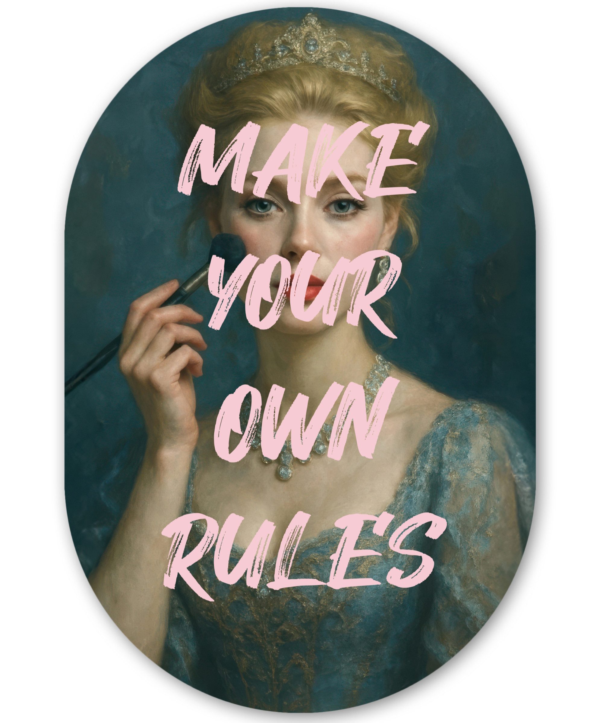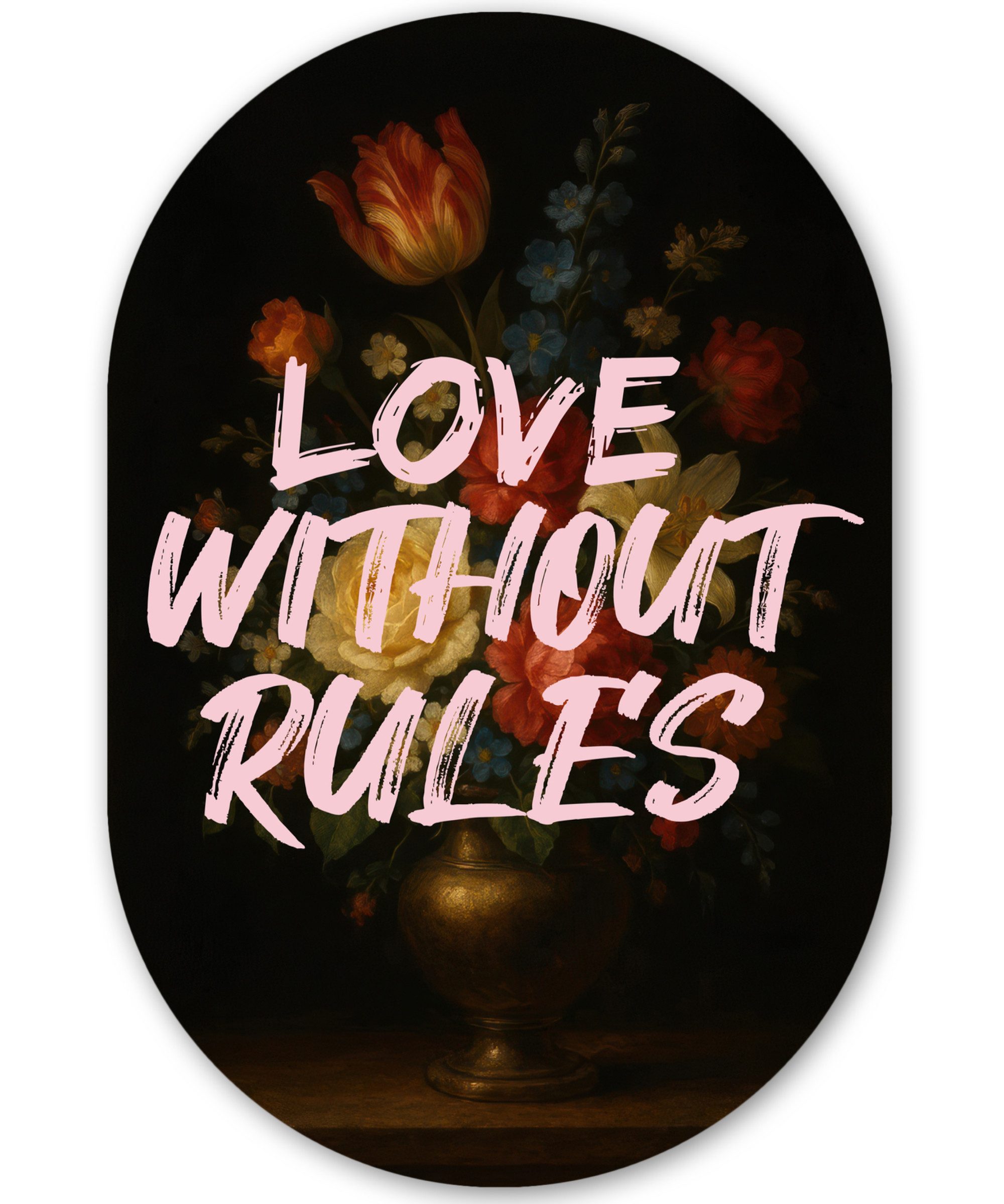 Eine klassische Blumenvase im malerischen Stil mit dem modernen Text "LOVE WITHOUT RULES" in rosa Buchstaben quer über das Bild.Kunstgenre | Modern, Natur, Tiere, Abstrakt, Kinderzimmer |
