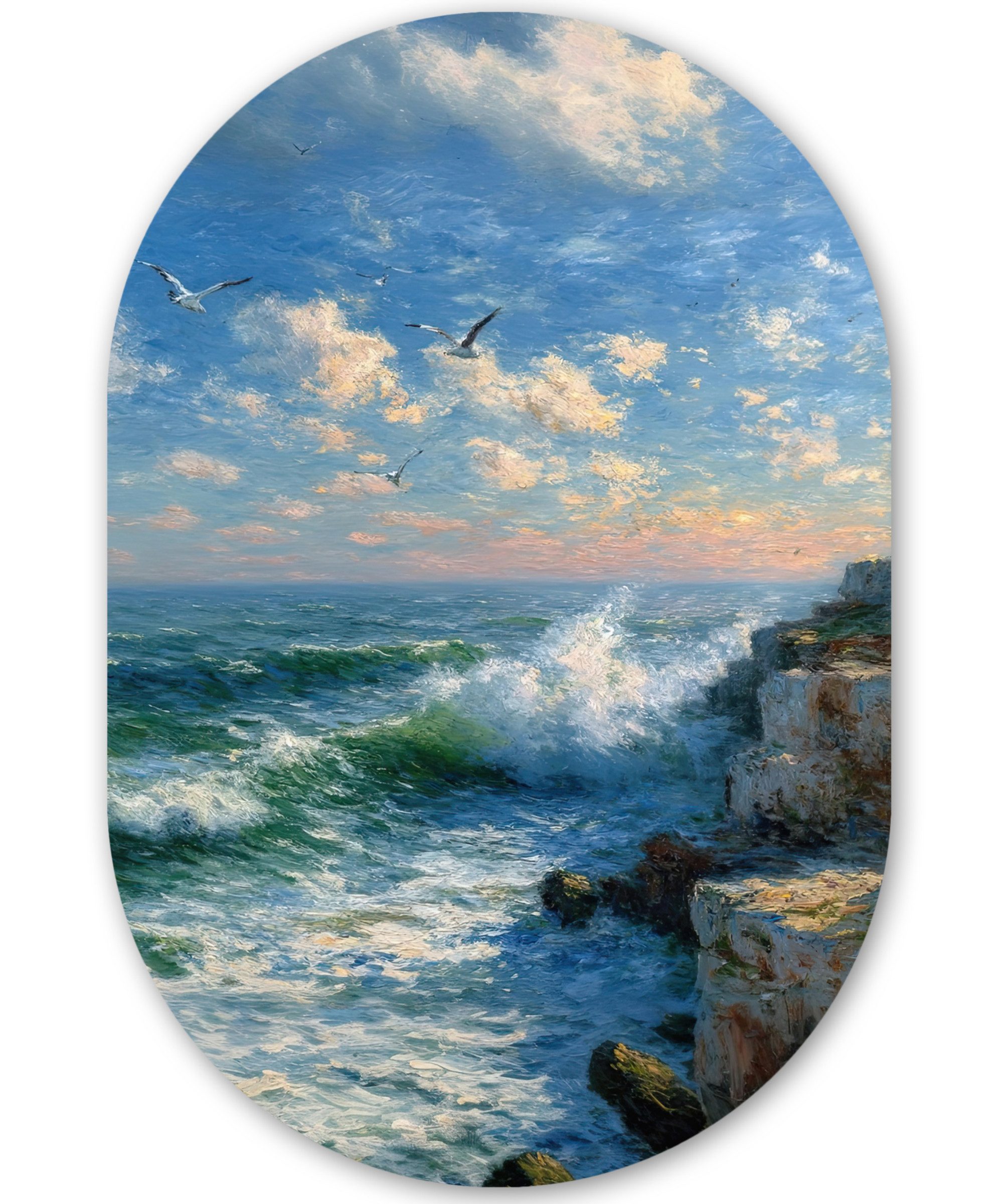 Malerisches Meer mit plätschernden Wellen gegen Felsen unter einem lebhaften Himmel mit Wolken und fliegenden Möwen.Kunstgenre | Modern, Natur, Tiere, Abstrakt, Kinderzimmer |