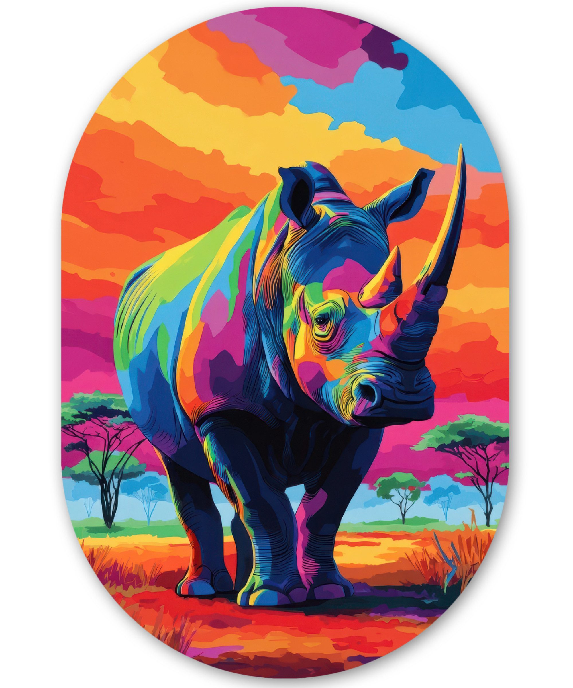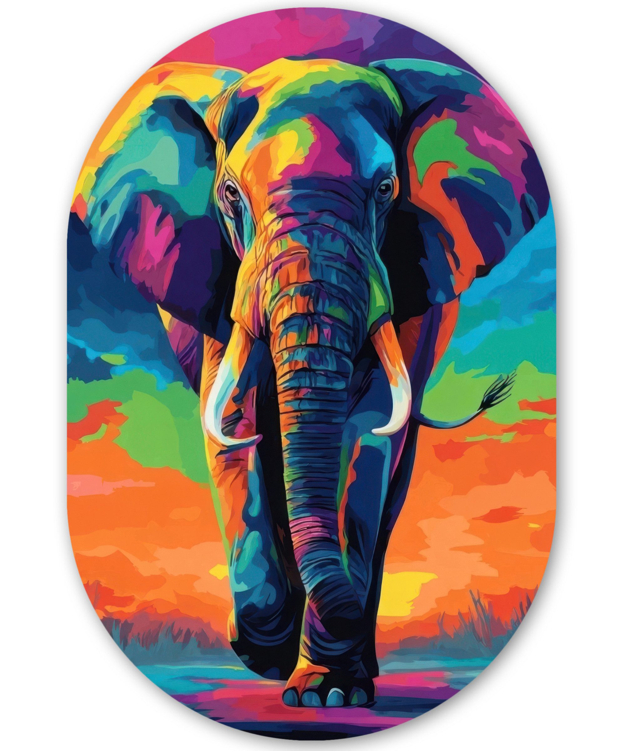 Unter einem dramatisch gefärbten Himmel voller Lila, Rot, Blau und Grün läuft ein beeindruckender Elefant direkt auf den Betrachter zu. Sein Körper ist in leuchtende, kontrastreiche Farben gehüllt, die seine Размер und Stärke in einem magischen, künstlerischen Stil unterstreichen.Kunstgenre | Modern, Natur, Tiere, Abstrakt, Kinderzimmer |