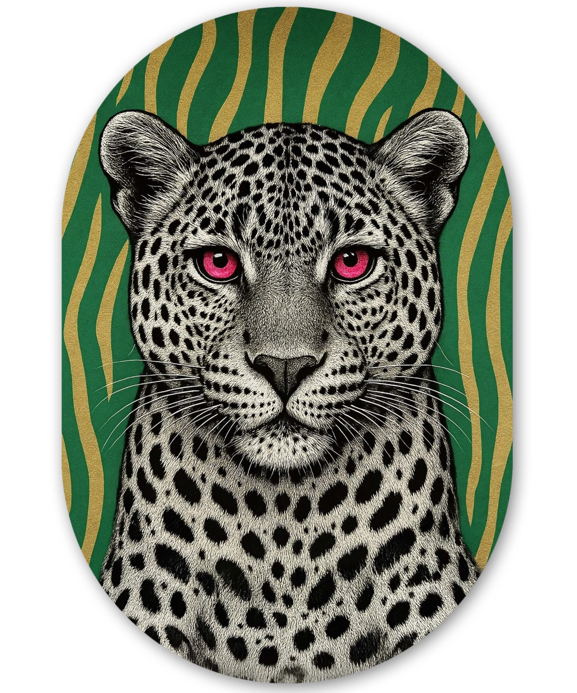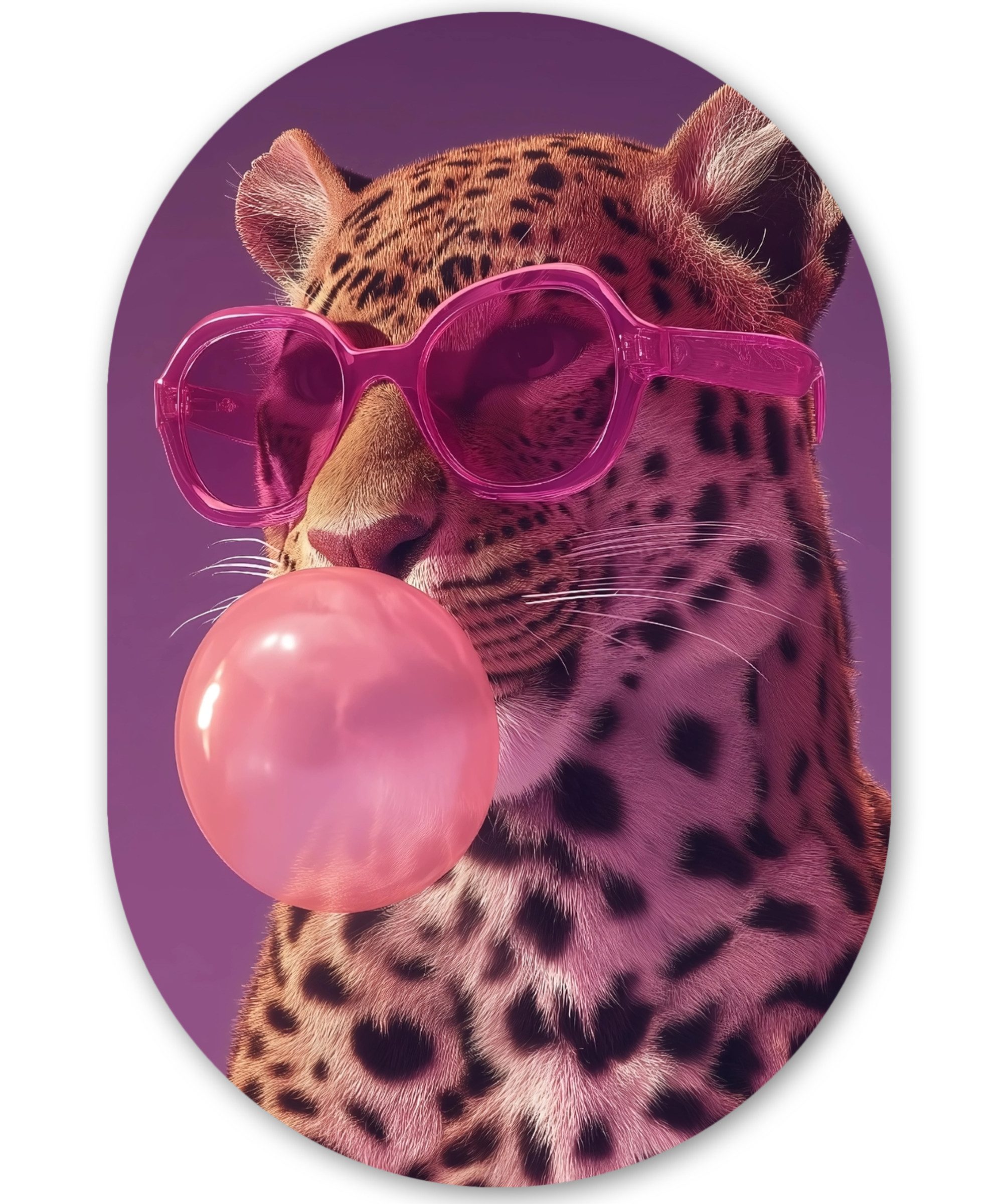 Ein Panther trägt eine rosafarbene Sonnenbrille und bläst eine rosafarbene Kaugummiblase vor einem lila-rosa Hintergrund, was einen verspielten und modischen Look ergibt.Kunstgenre | Modern, Natur, Tiere, Abstrakt, Kinderzimmer |