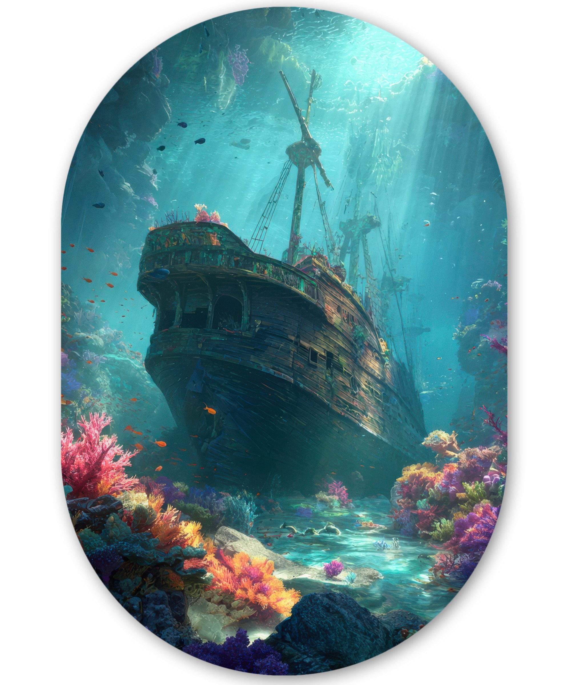 Ein altes Holzschiff liegt schief zwischen bunten Korallenriffen, beleuchtet vom Sonnenlicht, das durch das klare Wasser scheint.Kunstgenre | Modern, Natur, Tiere, Abstrakt, Kinderzimmer |