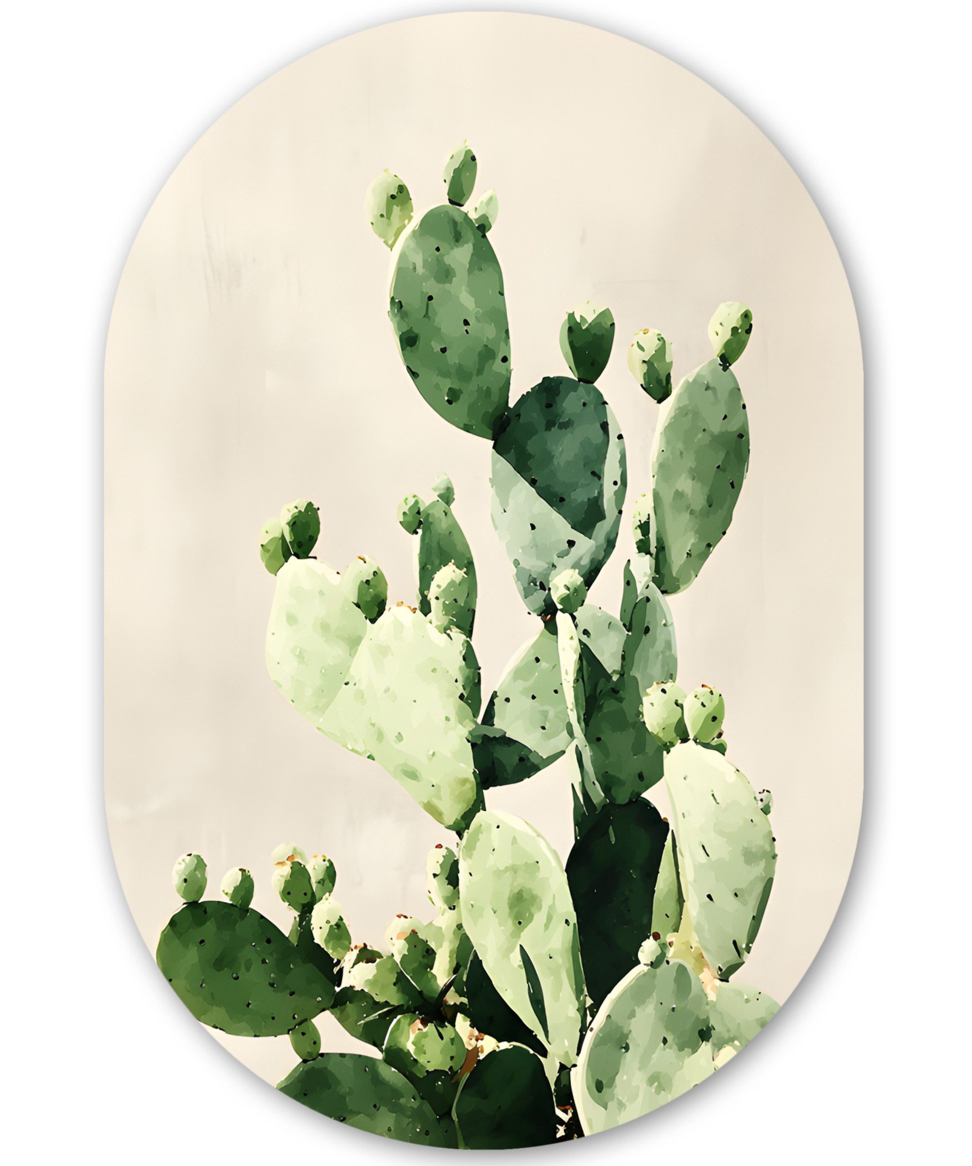 Ein grüner Kaktus mit ovalen Blättern und jungen Knospen steht vor einem hellen Hintergrund. Der minimalistische Stil unterstreicht seine natürliche Form.Kunstgenre | Modern, Natur, Tiere, Abstrakt, Kinderzimmer |
