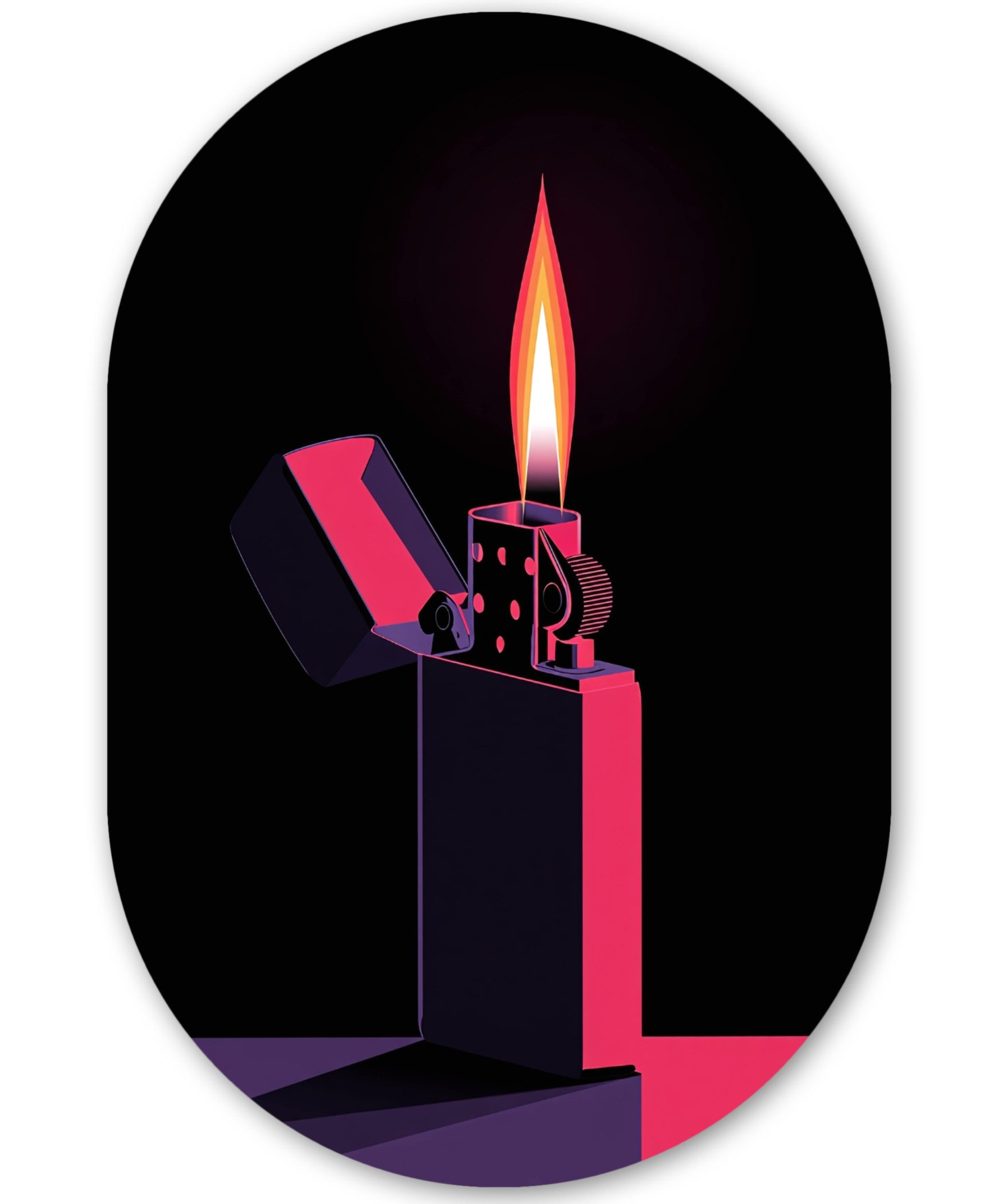Ein Metallfeuerzeug mit brennender Flamme ist geöffnet. Die Umgebung ist schwarz mit violetten und rosa Reflexen auf der Oberfläche und auf dem Feuerzeug.Kunstgenre | Modern, Natur, Tiere, Abstrakt, Kinderzimmer |