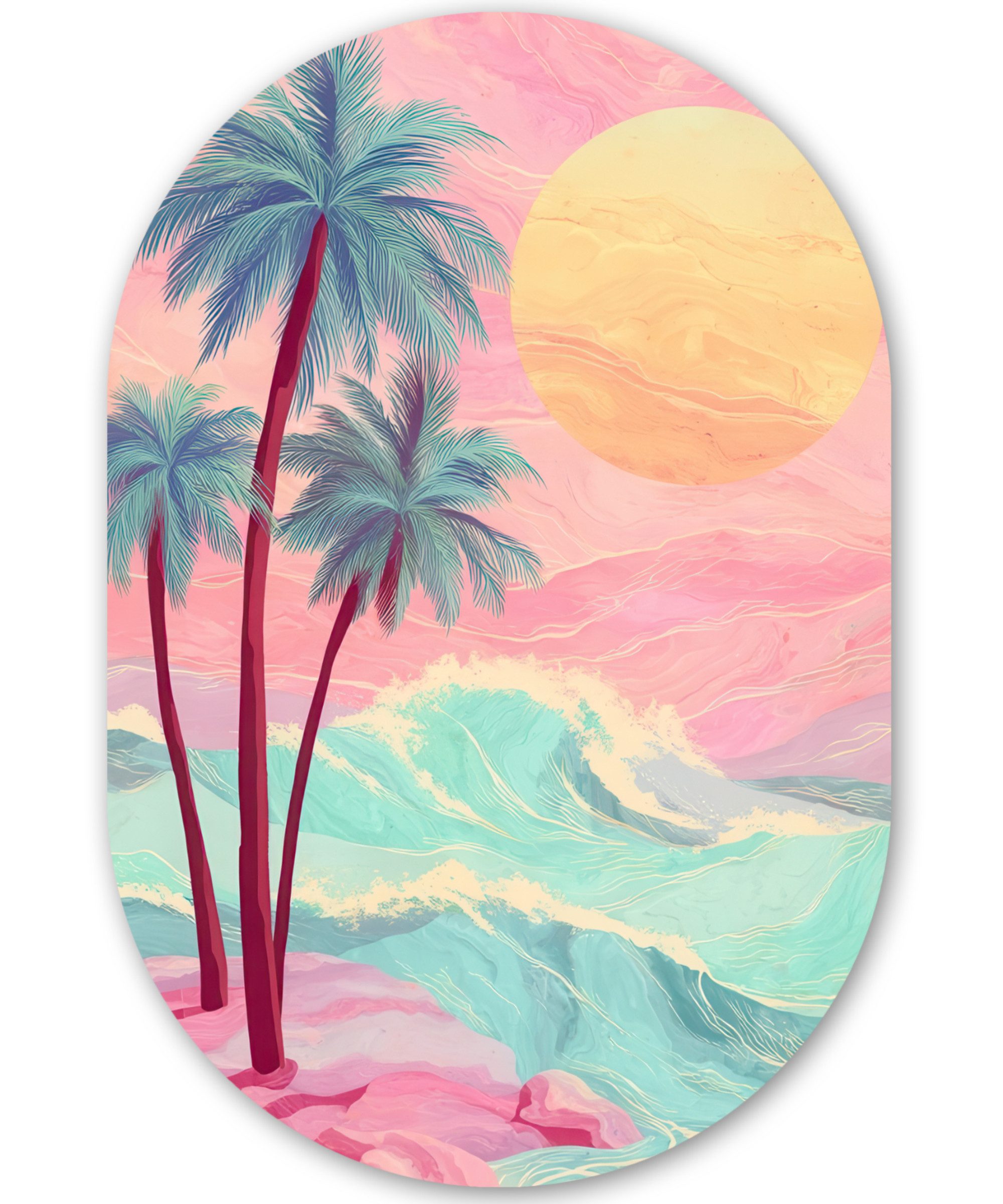 Drei Palmen stehen auf einer rosafarbenen Insel, auf der türkisfarbene Wellen gegen das Ufer schlagen. Eine große Sonne dominiert den rosa Himmel über dem ruhigen Meer.Kunstgenre | Modern, Natur, Tiere, Abstrakt, Kinderzimmer |