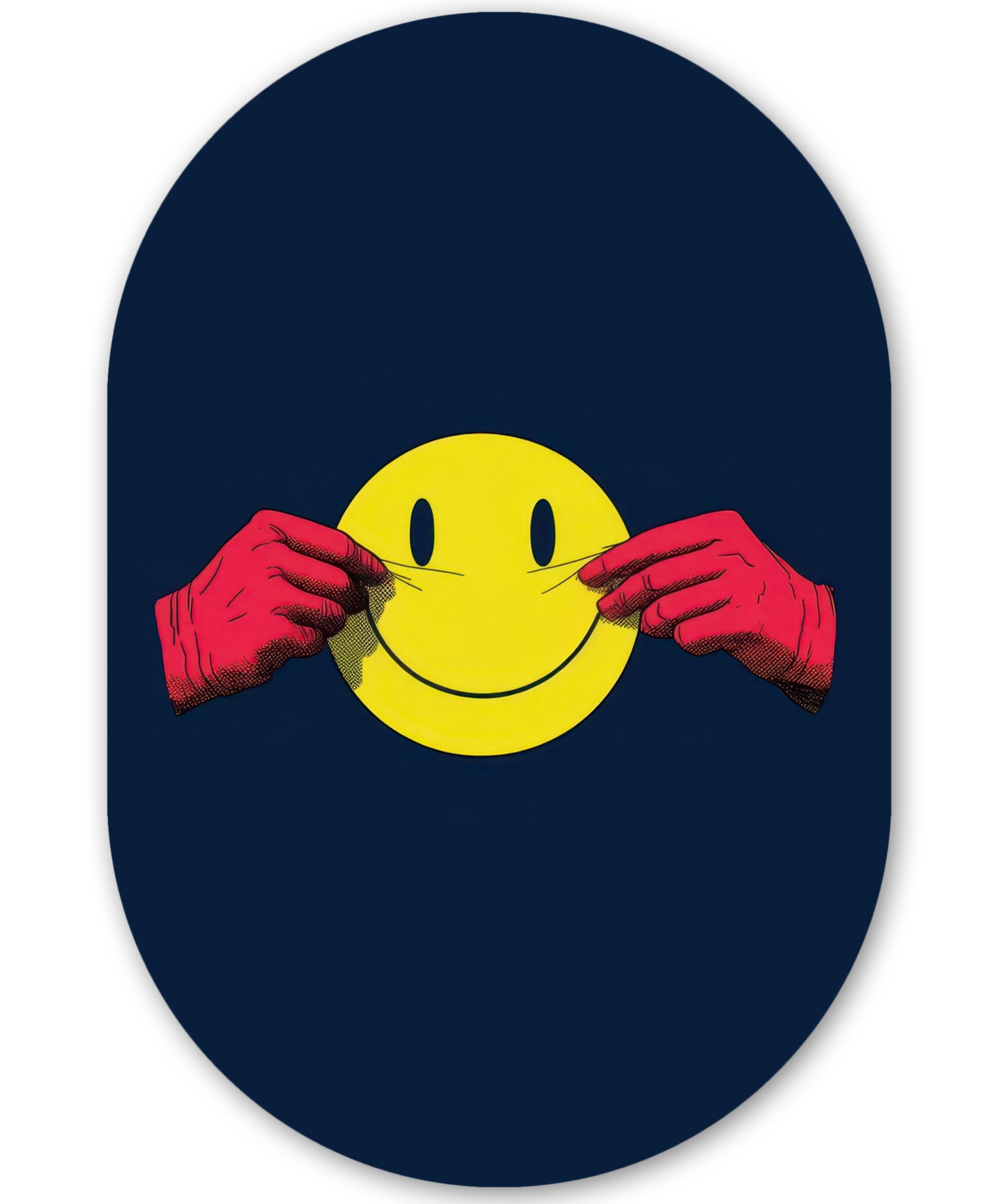 Ein gelbes Smiley-Gesicht wird mit roten Handschuhen vor einem dunkelblauen Hintergrund künstlich zum Lächeln gebracht.Kunstgenre | Modern, Natur, Tiere, Abstrakt, Kinderzimmer |
