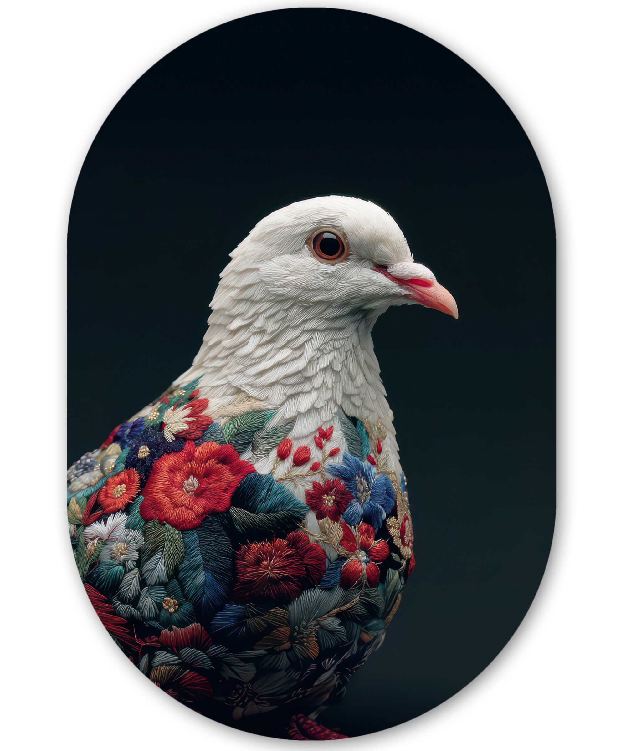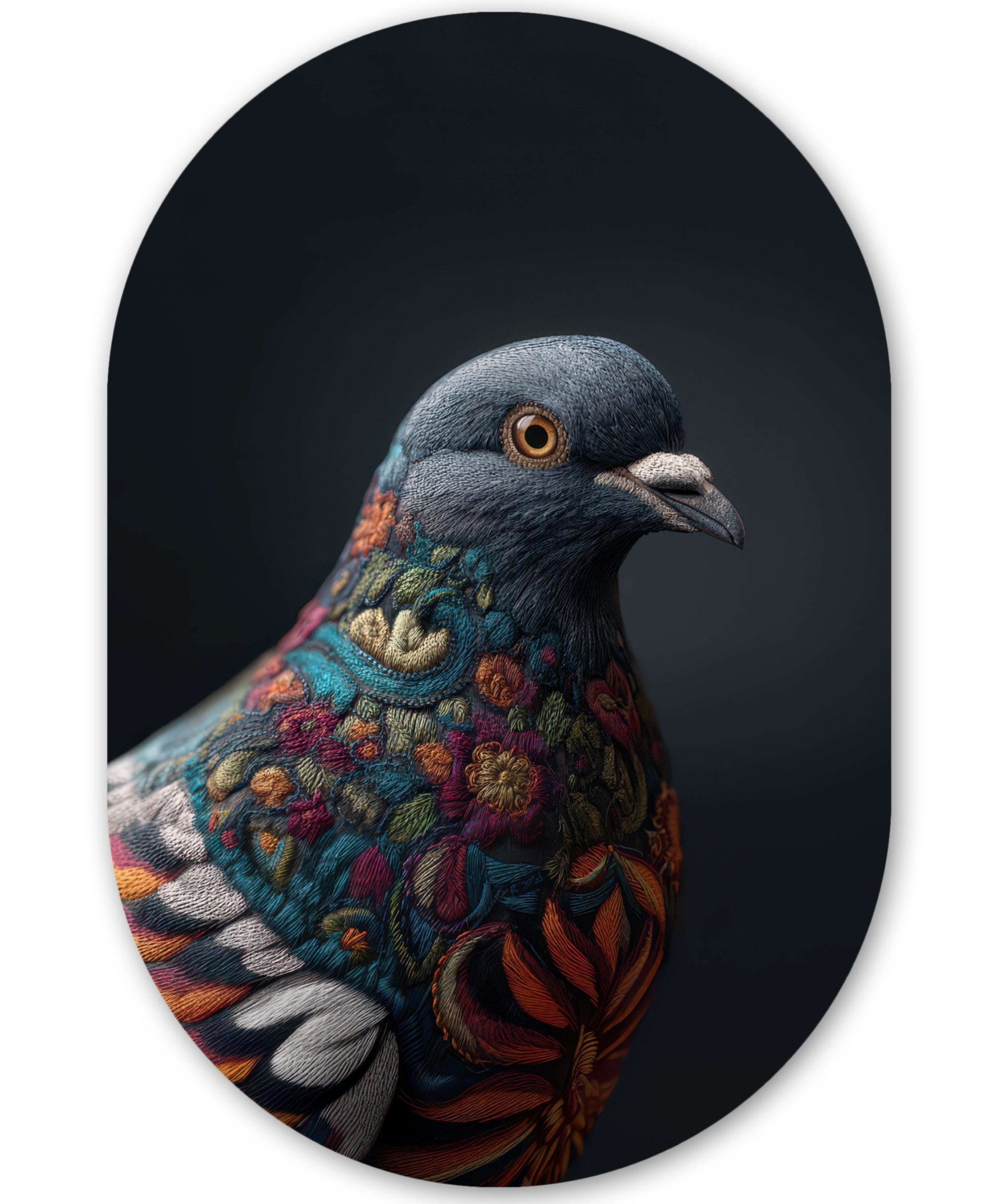 Eine graue Taube mit einem durchdringenden Blick trägt ein Gefieder, das mit Stickereien in Blau, Gold, Rot und Orange verziert ist. Die farbenfrohen Motive scheinen in die Federn eingewoben zu sein, wobei sich die floralen Muster bis zu den Flügeln erstrecken. Der dunkle Hintergrund unterstreicht die Textur und die Intensität der Details.Kunstgenre | Modern, Natur, Tiere, Abstrakt, Kinderzimmer |