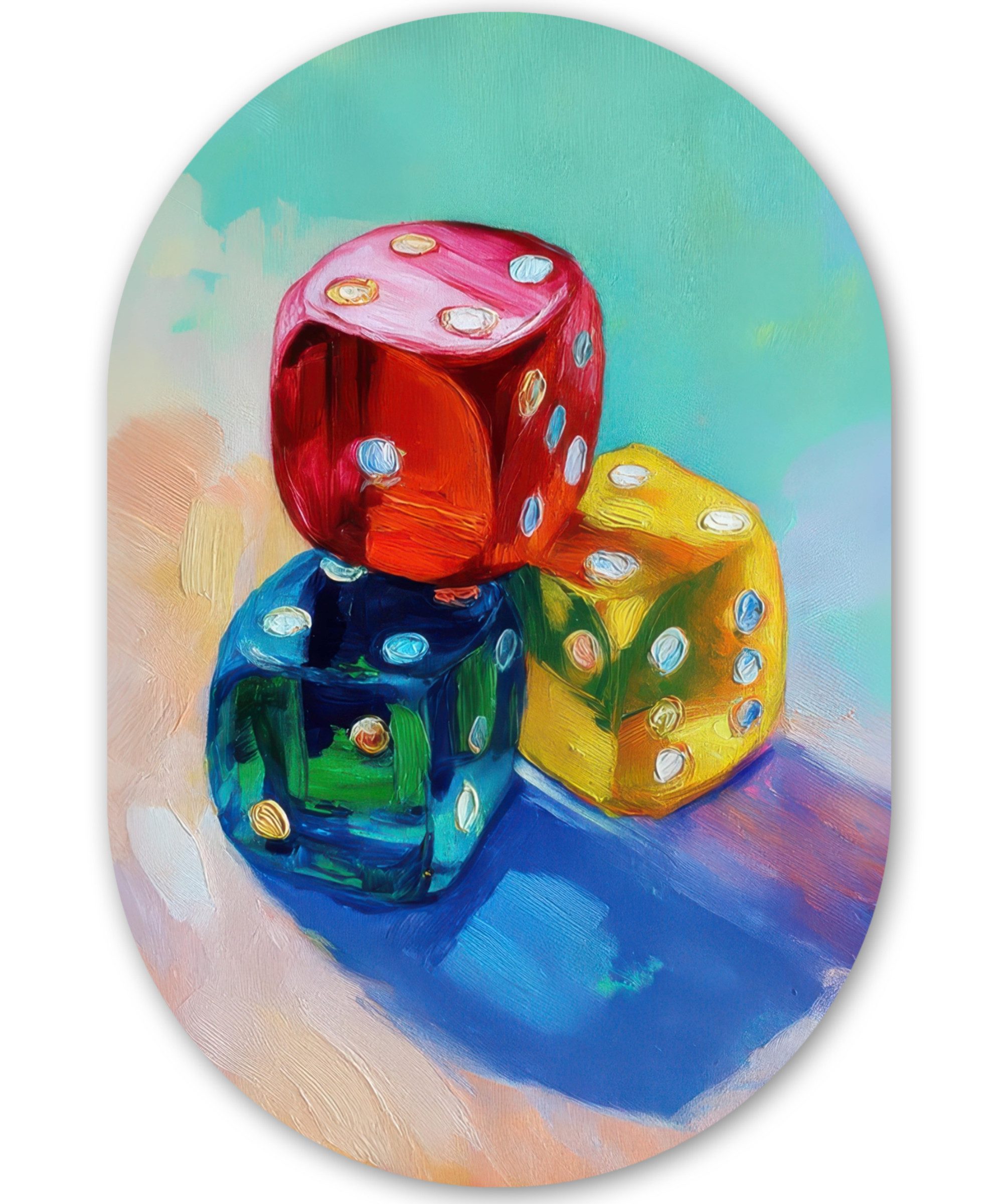 Drei Würfel in Rot, Gelb und Grün liegen vor einem mintfarbenen Hintergrund mit Reflexionen und weichen Schatten.Kunstgenre | Modern, Natur, Tiere, Abstrakt, Kinderzimmer |