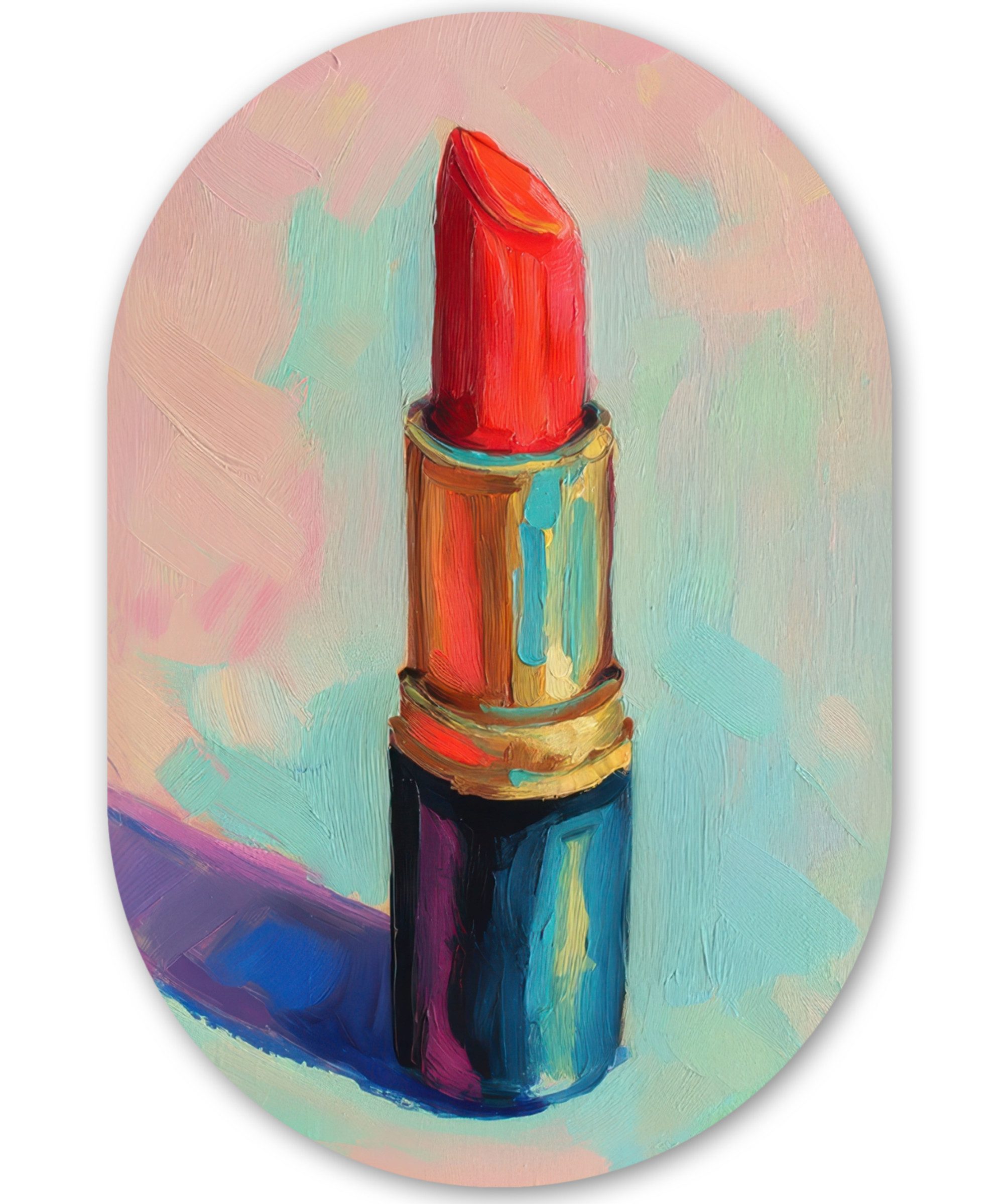 Ein leuchtend roter Lippenstift steht aufrecht auf einem blassrosa Hintergrund mit bunten Pinselstrichen rundherum.Kunstgenre | Modern, Natur, Tiere, Abstrakt, Kinderzimmer |