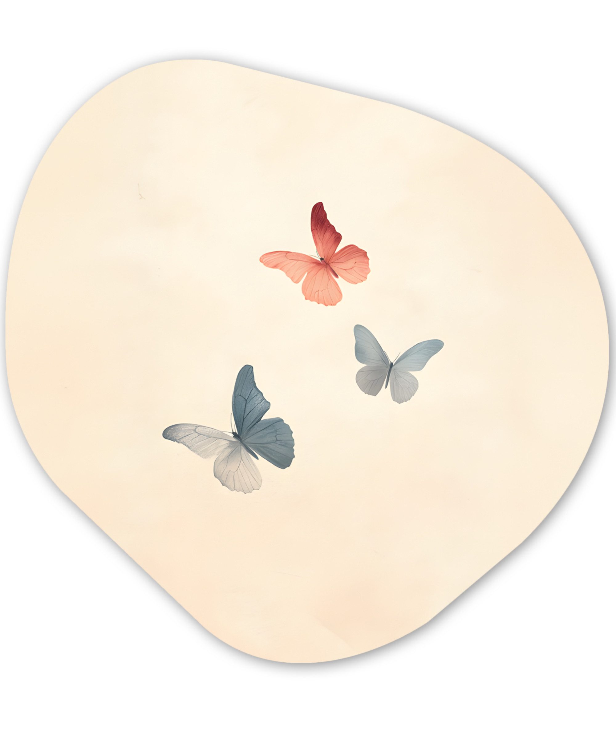 Drei Schmetterlinge schweben in einem weichen, beigen Raum; ein leuchtend orangefarbener in der Mitte, flankiert von zwei in verschiedenen Blautönen, mit zarten Flügeln, die Licht durchlassen.Kunstgenre | Modern, Natur, Tiere, Abstrakt, Kinderzimmer |