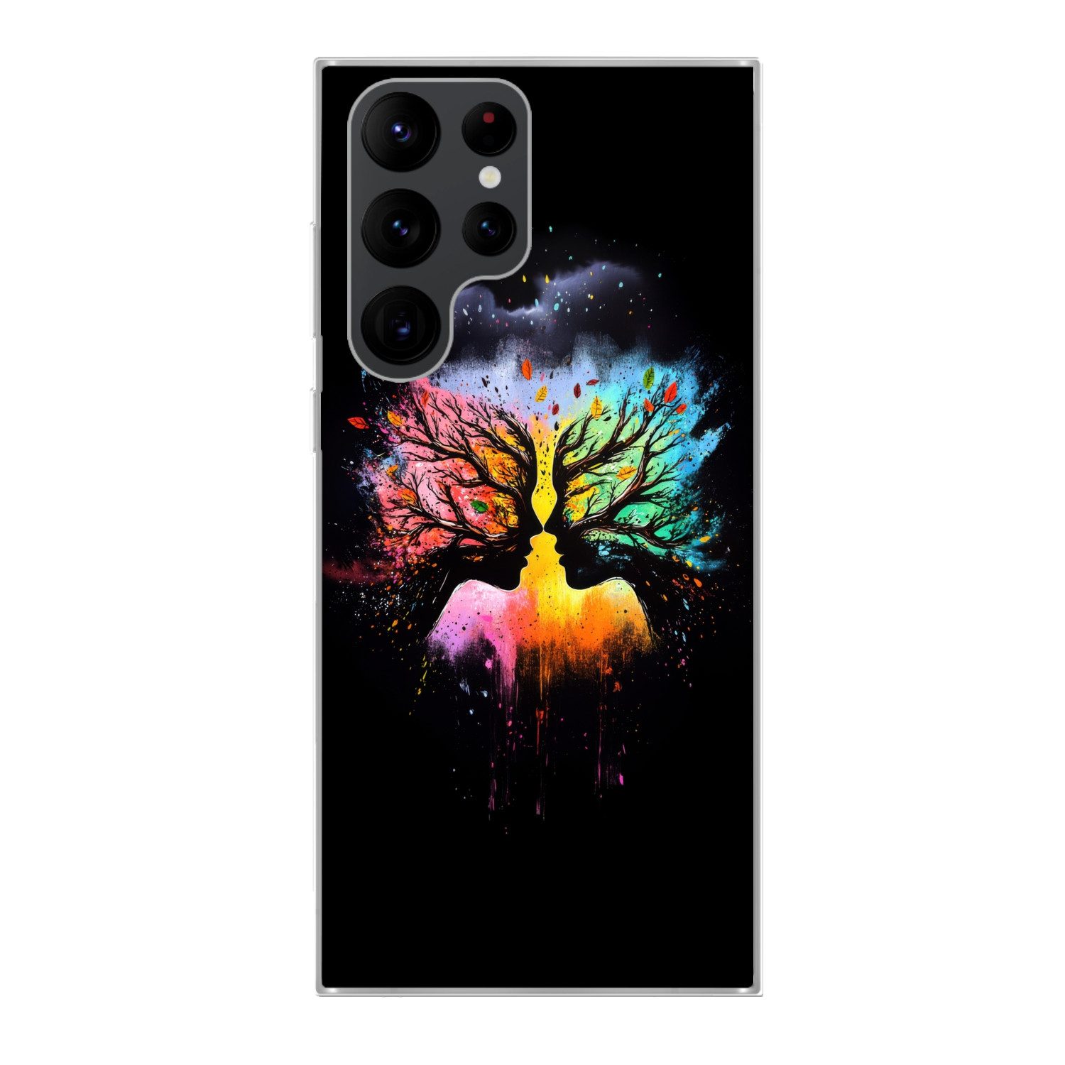 Zwei Silhouetten mit baumähnlichen Strukturen als Haare, gefüllt mit leuchtenden Farben und Herbstblättern. Der dunkle Hintergrund verstärkt den Lichteffekt der Spritzer und lebendigen Details.