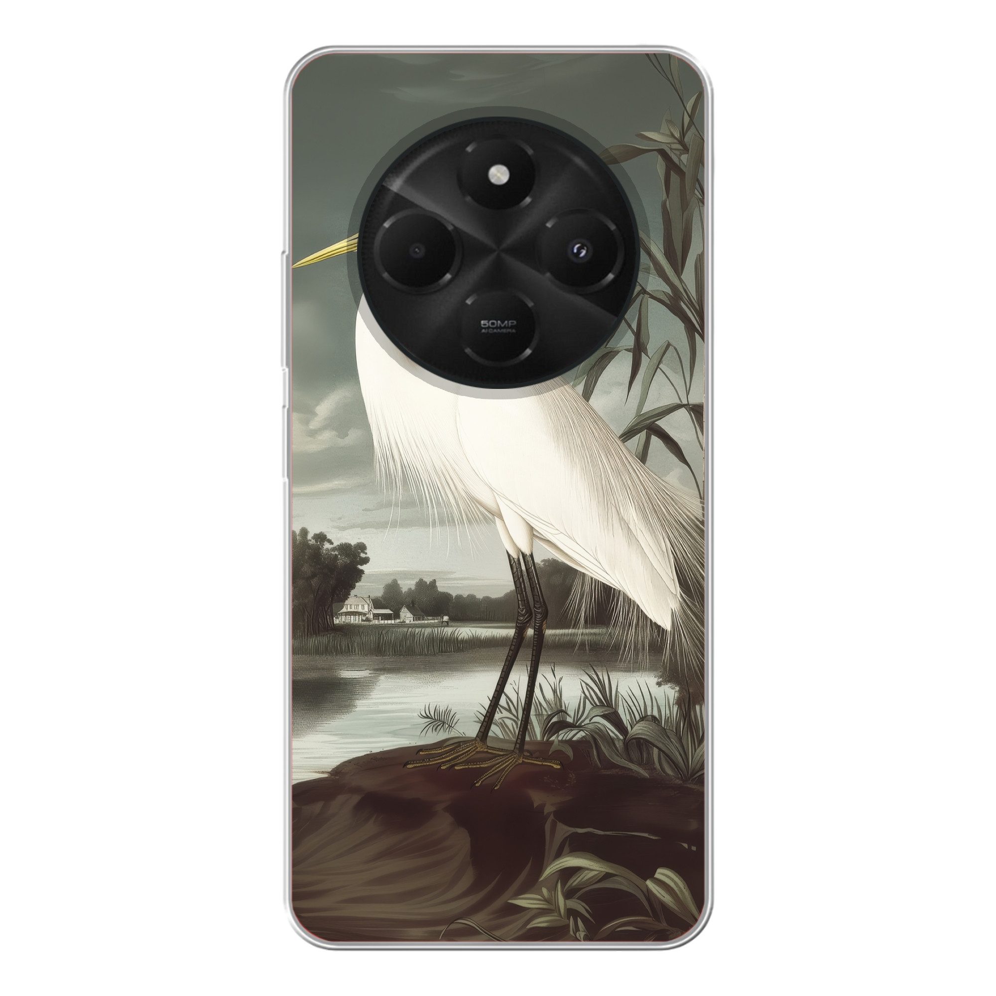 Ein weißer Reiher steht an einem ruhigen See. Um ihn herum wachsen hohe grüne Pflanzen. Der Himmel ist grau und wolkenverhangen. Der Reiher hat einen langen gelben Schnabel und weiche Federn, die sich im Wind bewegen.