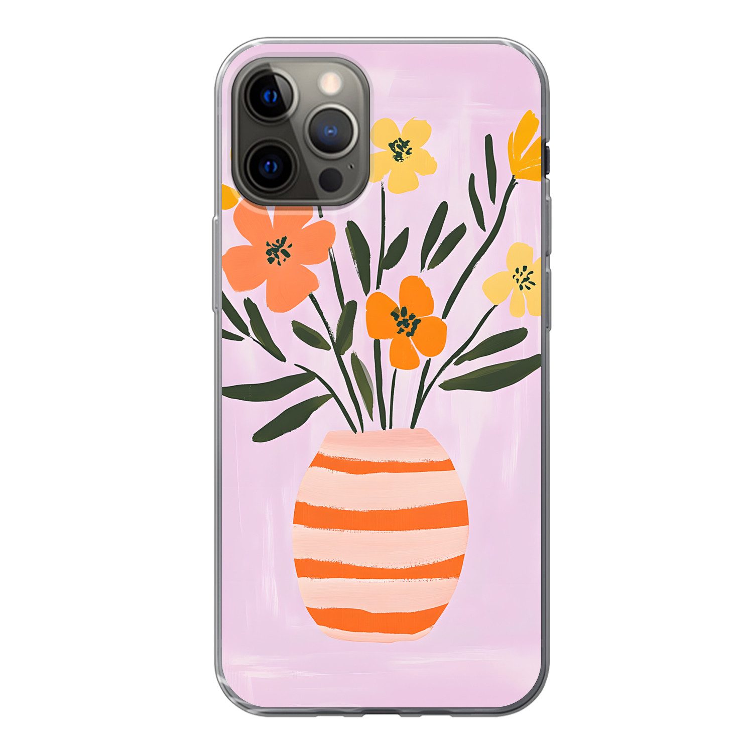 Eine gestreifte Vase mit leuchtend gelben und orangefarbenen Blumen steht im Mittelpunkt des Geschehens vor einem zartrosa Hintergrund.