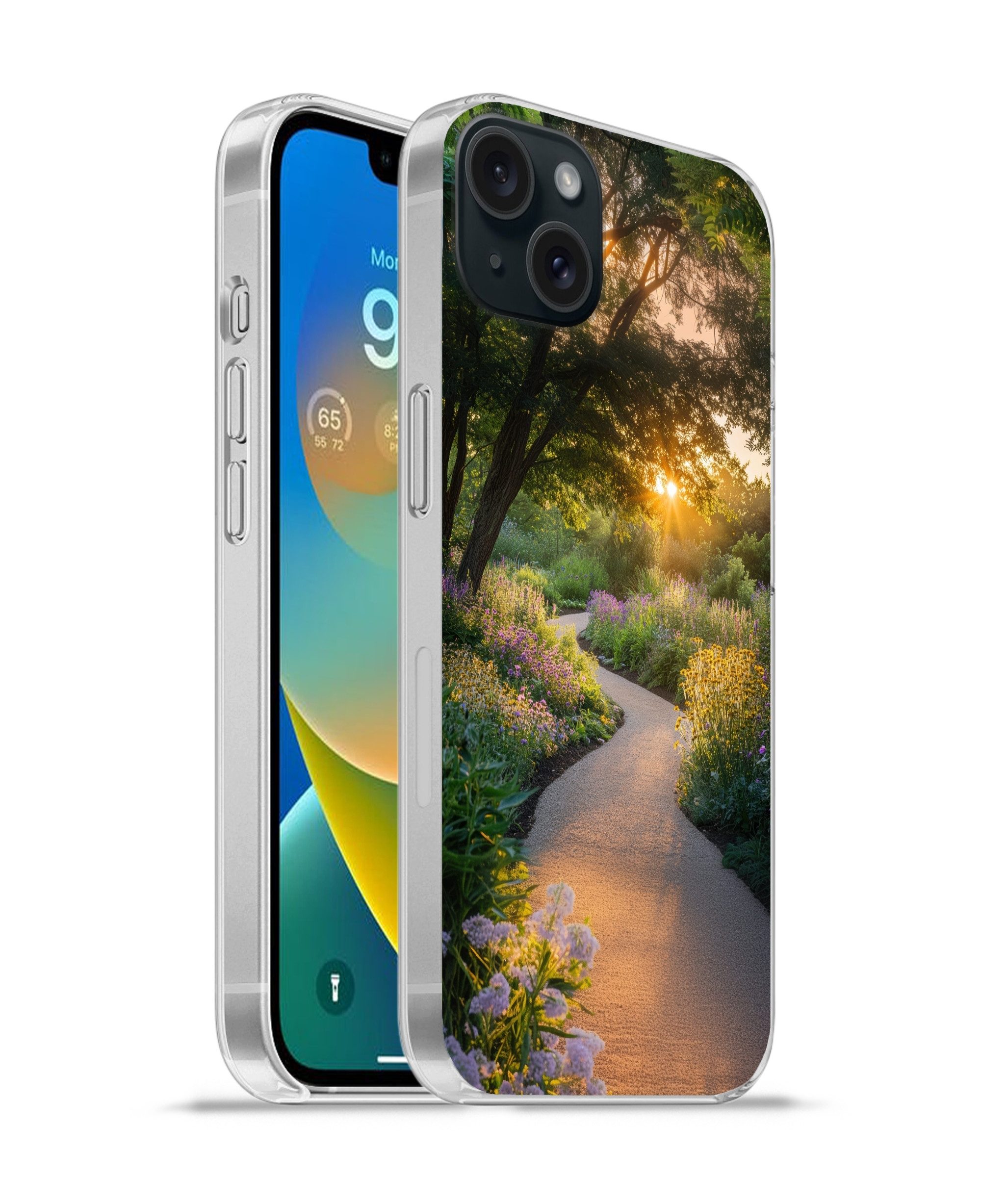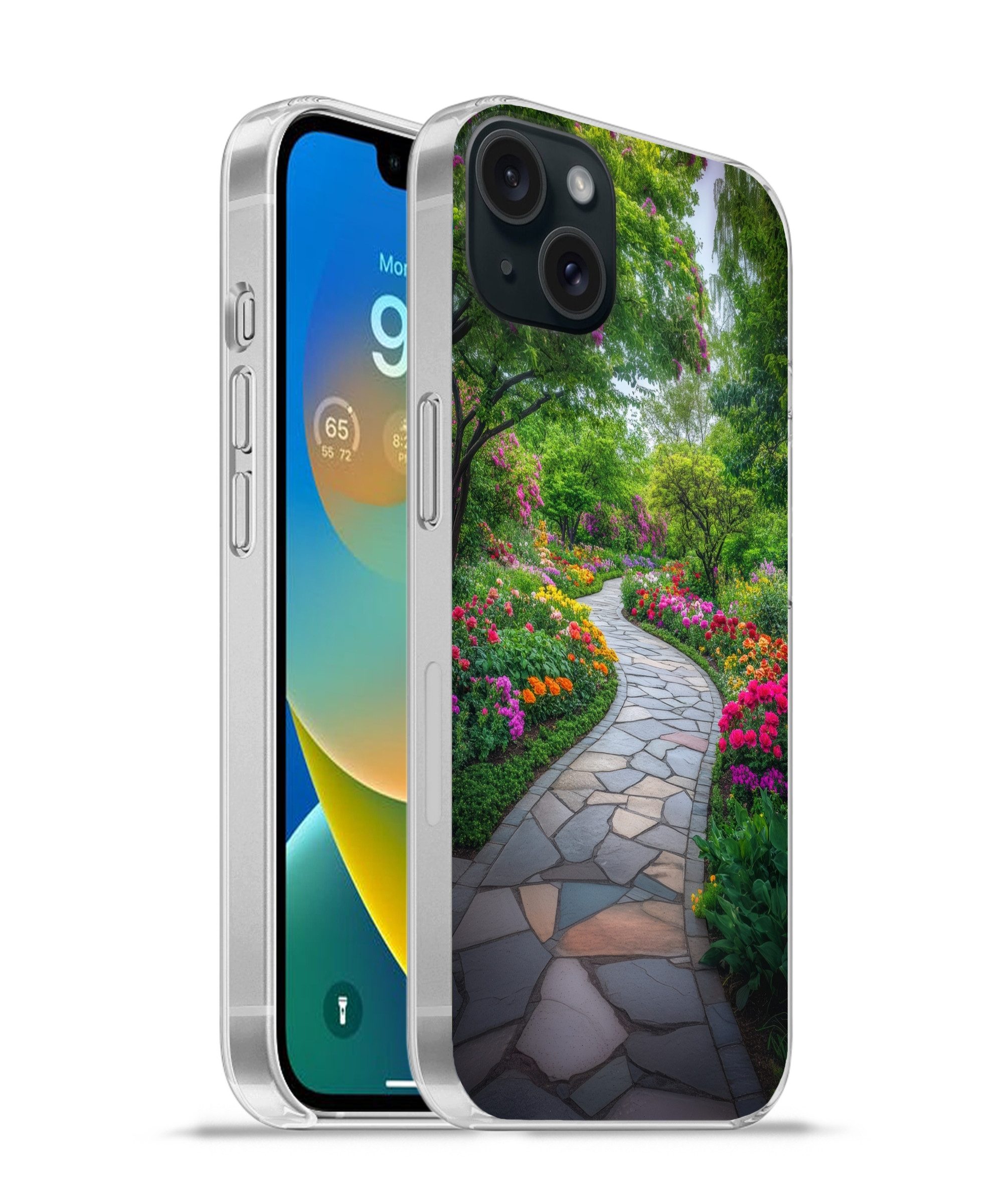 Ein gewundener gepflasterter Weg schlängelt sich durch einen verwunschenen Garten, umgeben von einer Explosion bunter Blumen in Rosa-, Rot-, Orange- und Violetttönen. Die üppig grünen Bäume und Sträucher schaffen eine friedliche und idyllische Atmosphäre, während die sanften Sonnenstrahlen die Landschaft sanft beleuchten. Ein perfekter Ort zum Entspannen in der Natur.