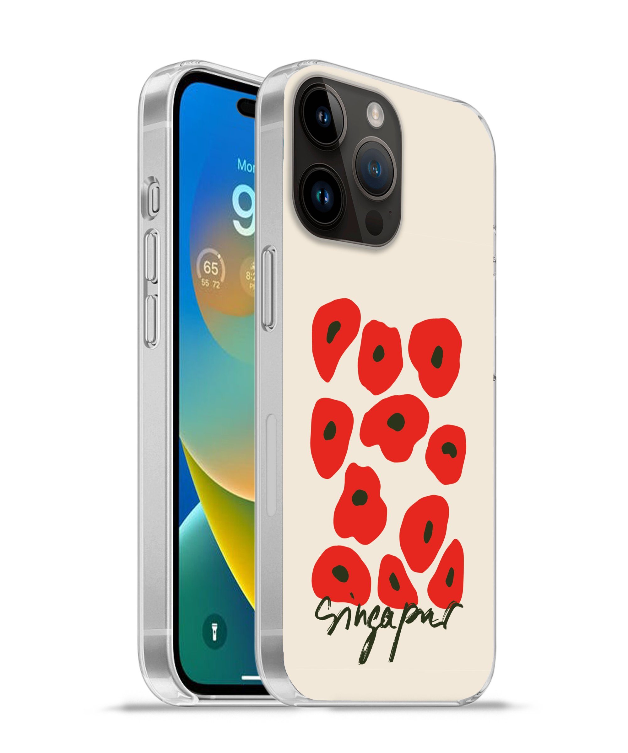 Abstraktes Muster mit Mohnblumen über dem Zitat 'Singapur'.