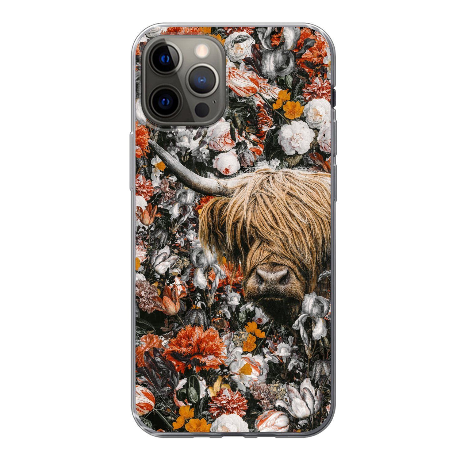Ein schottischer Highlander inmitten von Blumen und Tulpen in orange und schwarz-weißen Farben.Kompatible Geräte | Apple iPhone 13 Pro |